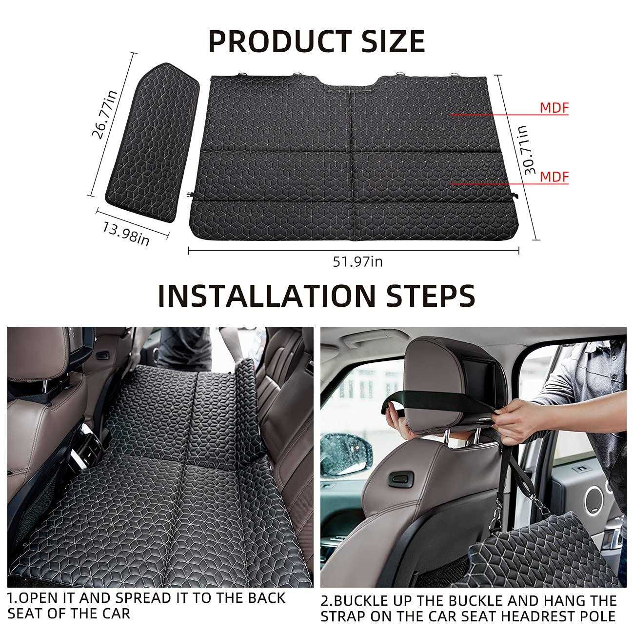 ABE Non-Inflatable Car Mattress,Double-Sided Folding SUV Mattress 【Non-Inflatable Design】 ABE non-inflatable car mattress do not need to be inflated. – Easier and faster to use. – No more worries about air leaks in the mattress. 【Double-Sided Design】 Both sides of the ABE double-sided SUV Mattress can be used. – One side is black premium PU leather, the other side is cartoon Oxford cloth. – Adults and kids love it. 【Foldable】 ABE car bed mattress can be folded, simple storage when not in use. – Camping mattress can be stored directly in the seat back or trunk. – It does not take up space. 【Easy to install】 Open the car travel camping bed and spread it to the back seat of the car. – Buckle up the buckle and hang the strap on the car seat headrest pole. 【Universal Fitment】 The size of the Car Mattress is 51.96*30.71 . First of all, the car seat should have a headrest bar. – Cars and SUV basically universal. You can first measure the size of the space in the back of your car, if greater than or equal to the size of our mattress can basically be installed.