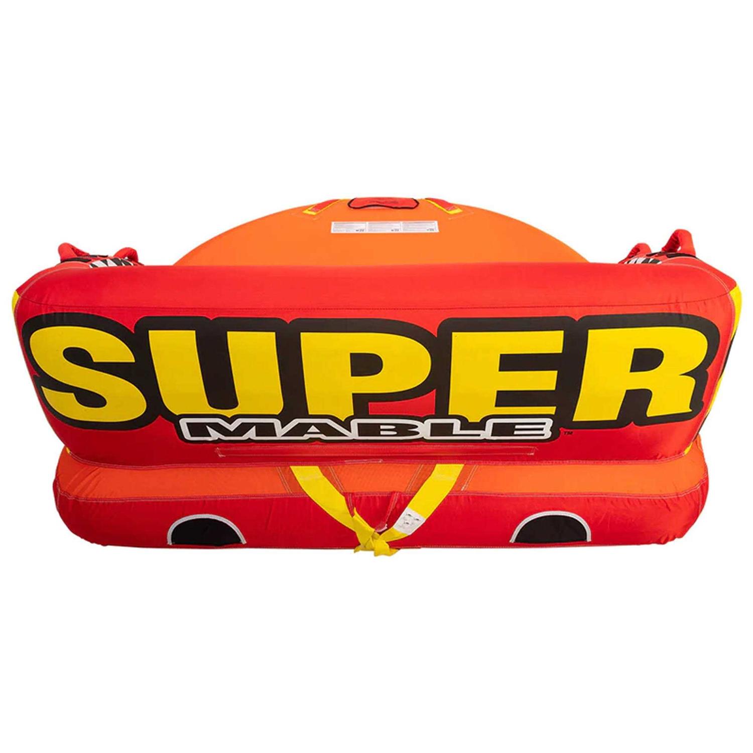 The Airhead Super Mable chariot-style towable tube holds up to three riders making it perfect for family outings. Kids and teens will enjoy the versatility of this tube with dual tow points which can be ridden two different ways. You can go for a wild ride utilizing the comfy backrest or tow it the opposite direction for a chariot style blast on the water youll never forget. It has 16 foam-filled handles with knuckle guards to enable tons of different riding positions. This action packed towable comes equipped with comfy EVA foam seating pads that make your ride smooth and enjoyable. The air cushioned side walls will keep you on board. It has a heavy gauge PVC bladder and the entire tube is covered with double stitched nylon to ensure both comfort and years of use. It has a patented simple valve for quick and easy inflating and deflating. Plus the Kwik-Connect tow point makes it easy to attach and detach at a moments notice. The bright orange color and racing-inspired design turns heads and inspires both speed and thrills. This large water tube doubles as a floating lounger so you can kick back and relax after a long day of excitement.