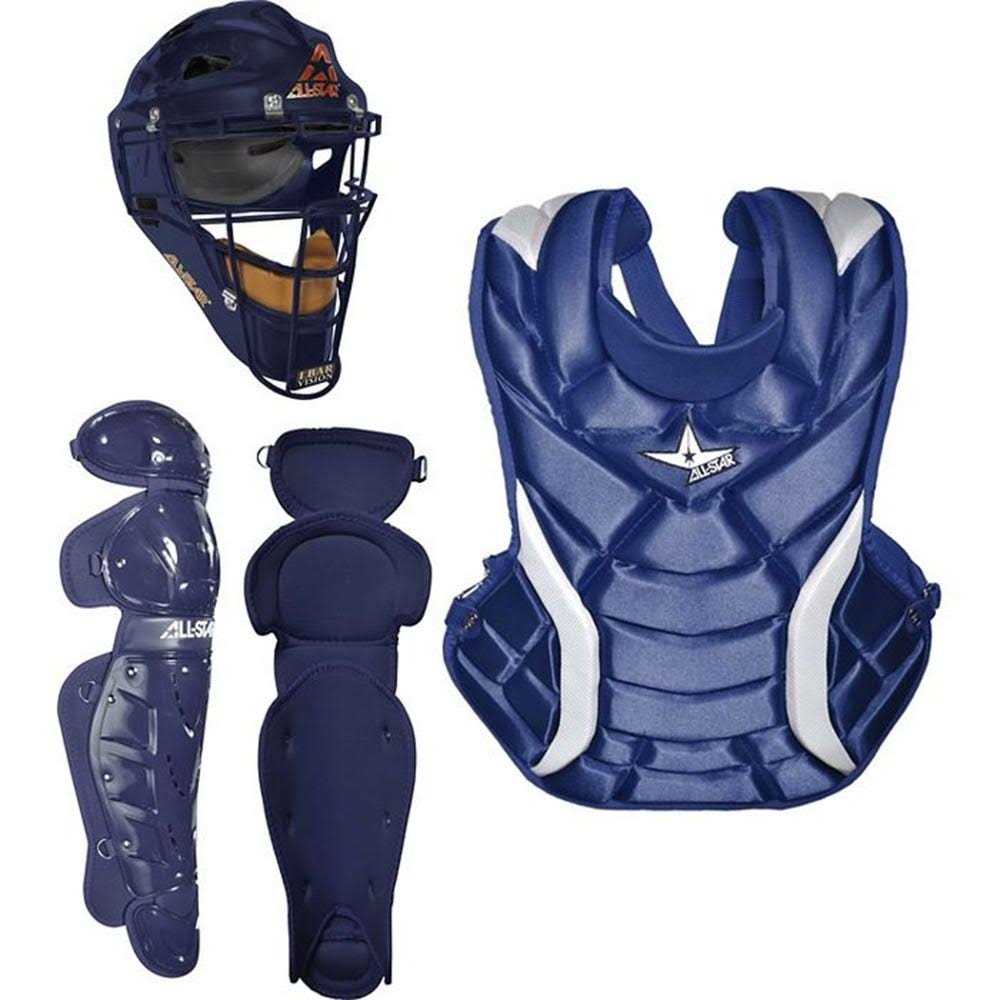 Gear-up with the adult Fast Pitch Series softball catcher’s package from All-Star Sporting Goods. Offering a similar look to the System Seven Kit, but is constructed with more economy materials. Featuring the Player’s Series Mvp hockey style catcher’s mask along with Player’s Series chest protector and leg guards. Also includes a catcher’s equipment bag. The Fast Pitch Series catcher’s set offers superior protection and comfort, plus a professional look. Recommended for ages 13 and up. Player’s Series Mvp Catcher’s Mask: Color: Navy.