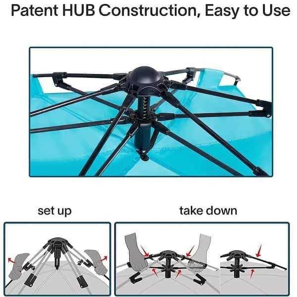 This Alvantor beach tent measures 96″x 102″ x 52″H which comfortably fits your whole family up to 4 adults, kids and pets. Used as a canopy, beach umbrella or sun tent, it can provide cool, all-day shade at park, beach, lake, camping and so on. Extra large for your whole family. Closed front side give you convenient privacy space. Patent pending HUB mechanic system on the top, which make tent open by itself effortless.