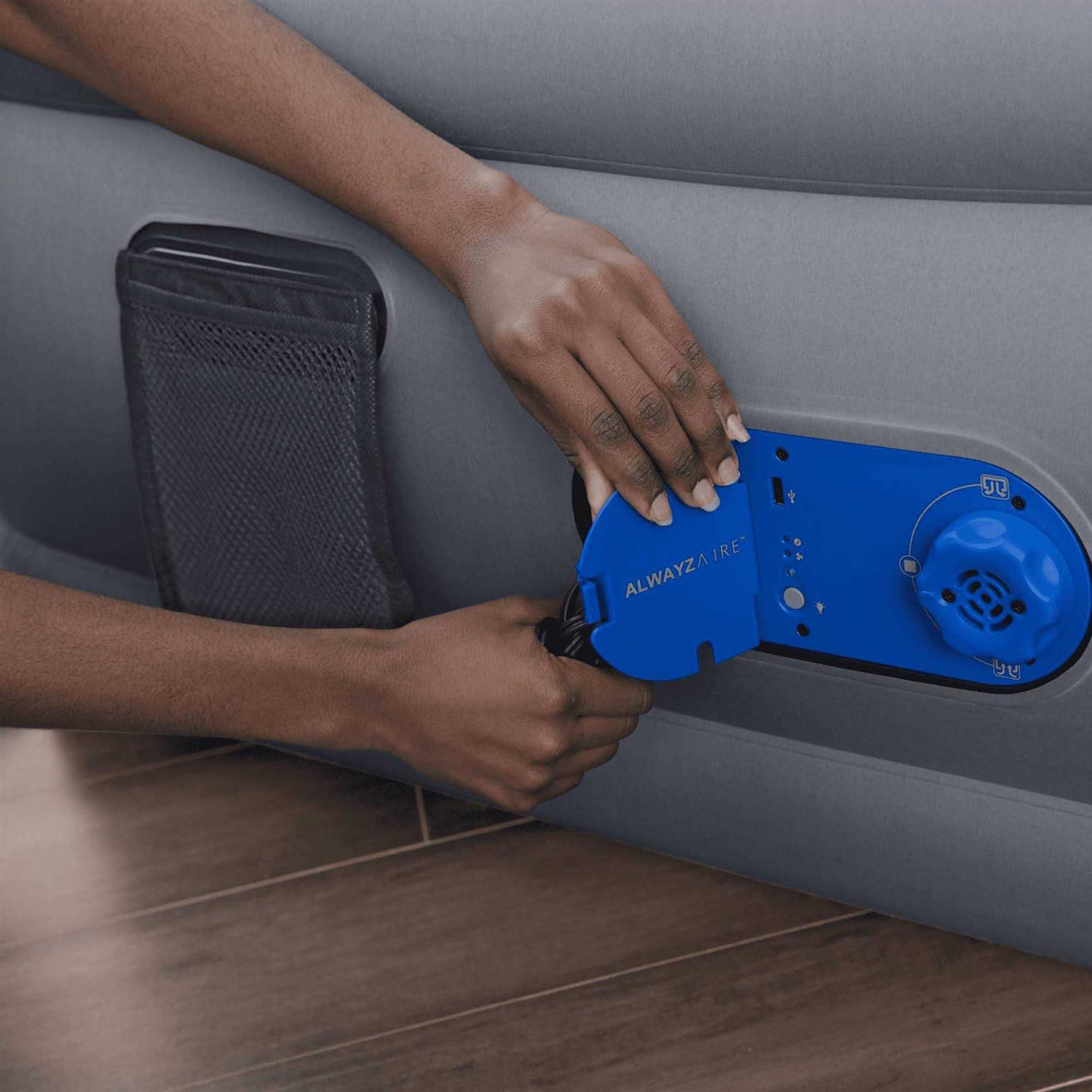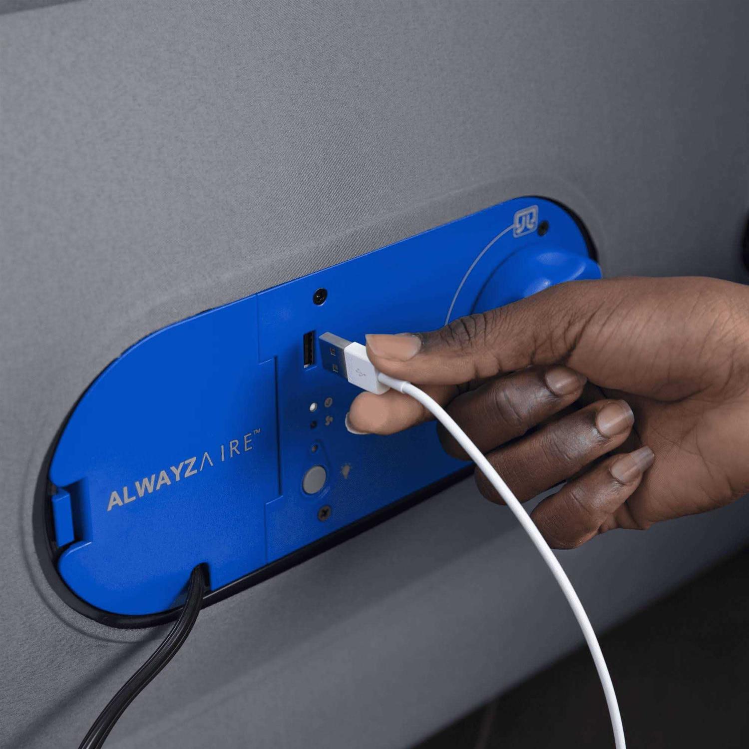 Whether it’s for a guest room or you need a bed to go the Fortech AlwayzAire 20 Queen Airbed from Bestway is a great choice. This airbed is designed to be just as comfortable as a traditional bed with firmness that lasts throughout the night. Fortech is the fusion of dense polyester fabric and durable PVC which provides high levels of strength durability and comfort. Set up is a breeze with the built-in 110-120V electric AlwayzAire pump ETL approved that monitors and maintains air pressure continuously. Easy to use features include a clear user-friendly pump control panel one-click operation and a soft back light that displays the settings in a dark room. A single USB port is located on the pump so you can connect and charge smartphones and tablets. Use the mesh pocket next to the pump to store items securely. Your guests will feel right at home with the canvas-feel fabric top outside and bottom. Enjoy a good night’s rest with internal sensors that detect air pressure continuously and a silent pump that maintains bed firmness throughout the night. A travel bag is also included for easy transport.