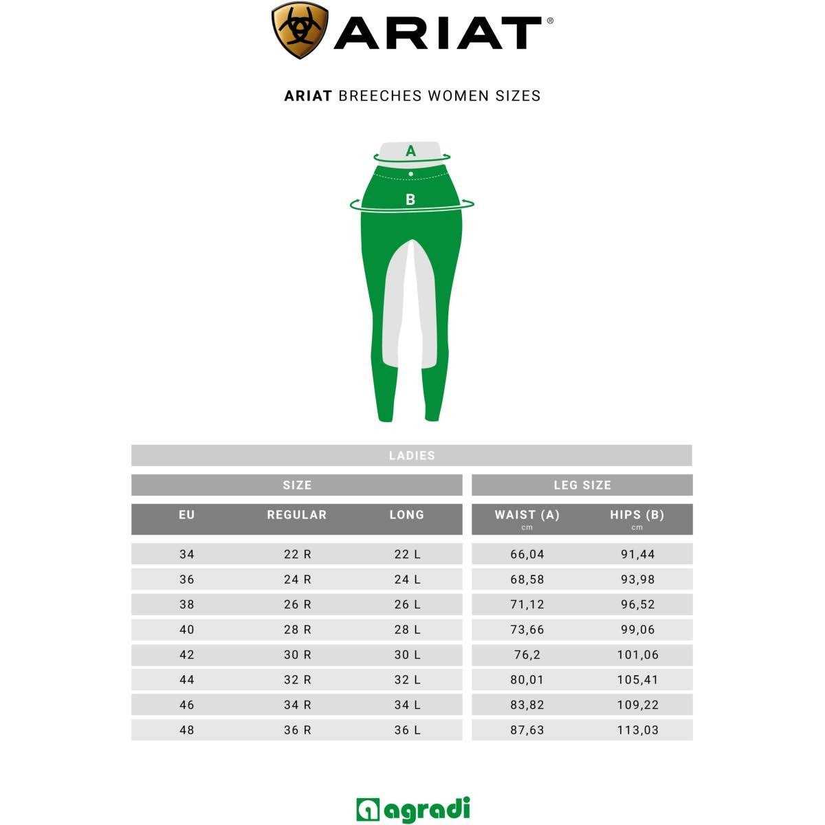 The latest addition to the Ariat trousers collection stands for style, comfort and exceptional grip. Made from lightweight stretch material and equipped with Icefil cooling technology to keep the rider cool and comfortable on hot days. The flexible Ariat silicone grip knee pads offer optimum grip in the saddle. In addition, the V3 technology offers exceptional stretch and connection around the legs. Additional features include the Ariat’s Calf Fit System to reduce friction under the riding boots, the Moisture Movement Technology to remove moisture from the skin and the Core Control Technology to emphasize a slim figure. On the back there are fake flap pockets with an Ariat logo for the finishing touch.