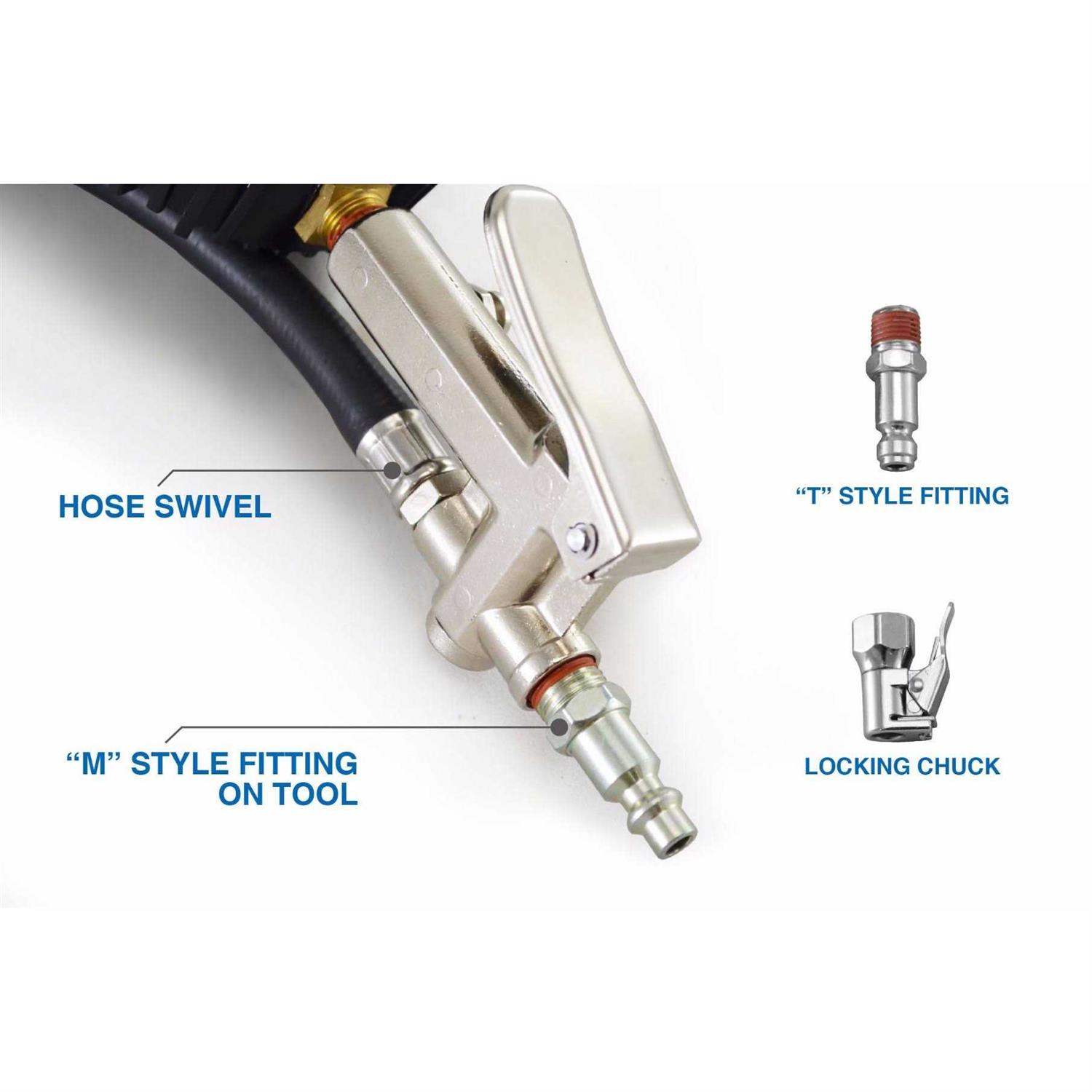 - Includes a 15” swivel hose dual chuck locking chuck and “M” & “T” style air fittings with thread sealant