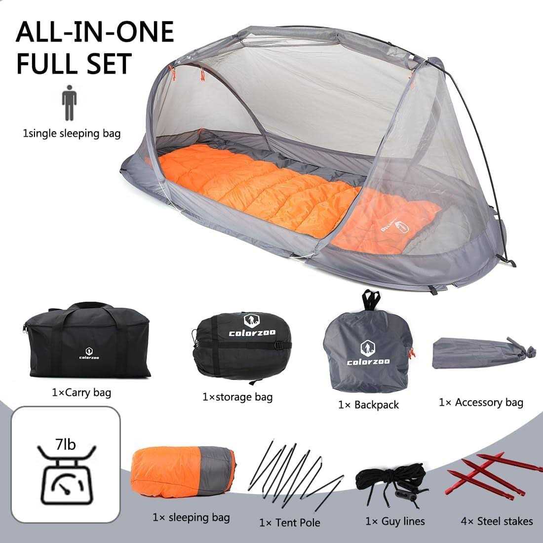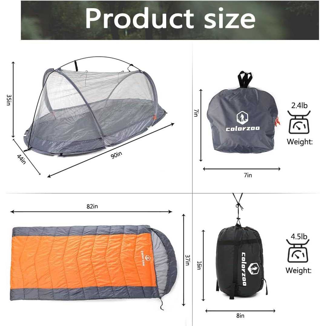 Single Person Personal Bivy Tent: Rated Between35°F to 80°F: Mosquito Net and Sleeping Bag Combo – Ideal for spring, summer, autumn, and moderately cold weather, rated between 35°F to 80°F (comfort zone 60°F to 70°F). Our signature weatherproof matrix-tech outer shell, enhanced with double-layered S-shaped stitching, and thermal synthetic fiber filling ensure warmth, protection, and insulation against the elements. Spacious Single Person Personal Bivy Tent Design: Immerse yourself in a spacious haven with our Camping Bivy Tent. The mesh construction ensures optimal airflow, creating a secure and breathable environment for a restful night’s sleep. Crafted with the solo camper in mind, this tent emphasizes Mosquito Tent protection. Indulge in comfort with our versatile Sleeping Bag, designed for all seasons. Whether it’s a chilly night or a warm day, the premium insulation and integrated mosquito-resistant features ensure uninterrupted sleep, complementing the protective attributes of the Mosquito Tent. Our combo features advanced Anti-Mosquito Technology, constructing an effective barrier against bothersome insects. The prominent Mosquito Tent and Sleeping Bag duo work in tandem to ensure a peaceful night, providing double the assurance for Bivy Tent protection. Versatile Outdoor Companion with Enhanced Mosquito Tent Features: From camping to hiking, backpacking to travel, our Camping Mosquito Tent with Sleeping Bag Combo is your go-to outdoor companion. The compact and lightweight design, along with the included carry bag, makes it easy to transport, setting you up for unforgettable outdoor experiences with maximum convenience and enhanced Bivy Tent protection. Spacious Mosquito Net Design: Enjoy ample space for a single camper with our Camping Mosquito Net. The mesh construction ensures optimal airflow, creating a secure and breathable environment for a restful night’s sleep, free from mosquito interference. Ultimate Mosquito Protection: Elevate your camping experience with our Camping Mosquito Tent with Sleeping Bag Combo. This all-in-one solution integrates a spacious Mosquito Net and a cozy Sleeping Bag, providing unmatched protection against pesky insects during your camping, hiking, backpacking, or travel adventures. Premium Mosquito Tent and Sleeping Bag Combo: Elevate your camping adventures with our exclusive Camping Mosquito Tent with Sleeping Bag Combo. Tailored for the solo camper, this all-in-one solution seamlessly integrates a spacious Mosquito Tent and a cozy Sleeping Bag, providing unparalleled protection against pesky insects during camping, hiking, backpacking, or travel. Embark on your next adventure fully equipped with our one-of-a-kind combination of a large single-person mosquito net and sleeping bag. Whether you’re a solo traveler, camper, or outdoor enthusiast, our innovative set provides the perfect solution for a comfortable and mosquito-free sleep experience. Versatile Combo: This set seamlessly integrates a spacious mosquito net and a cozy sleeping bag, ensuring an all-in-one solution for your outdoor needs. The tent’s automatic unfolding, coupled with the bug-be-gone technology, creates a sanctuary for you to relax without any worries. Made from high-quality materials like polyester fiber and PVC coating, the tent not only offers excellent ventilation but also provides a barrier against mosquitoes. Dimensions of 90x44x35 inches when unfolded provide ample space, while the collapsible aluminum frame makes it a breeze to pack up.