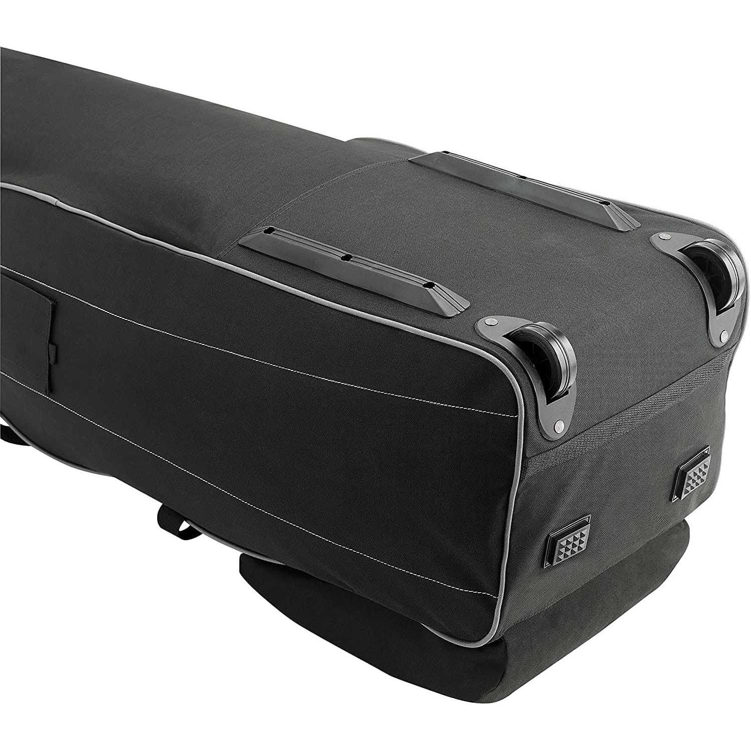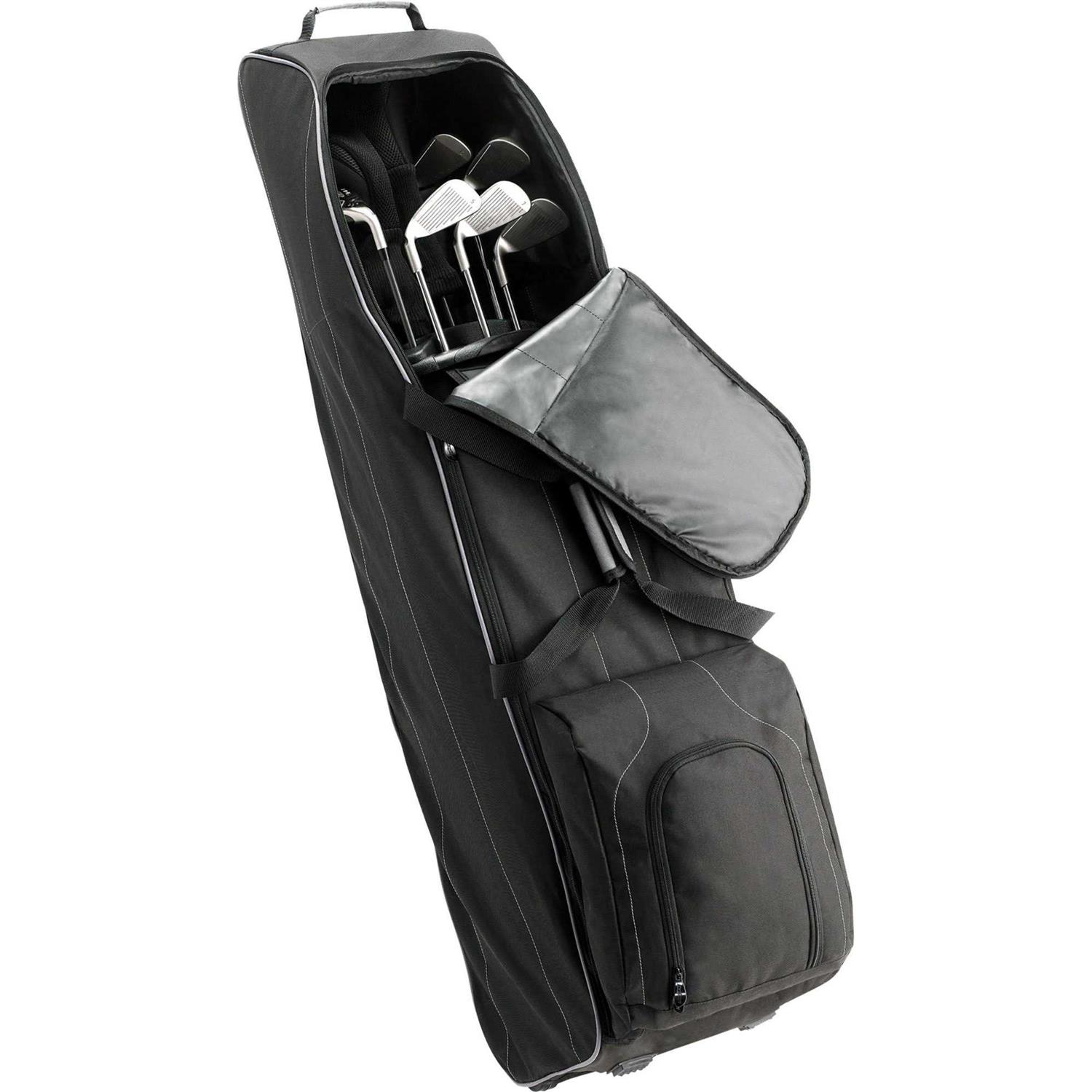 The Bag Boy T-460 Travel Cover is great for when you want to safely carry your clubs with you on your travels. It features smooth rolling wheels and reinforced corners for durability, lockable wrap-around zipper for easy access to club compartment, and reinforced nylon carrying strap with velcro locking handle. Additionally, this travel bag has internal compression strap to stabilize the bag during travel, oversized dual zippered shoe/garment pocket, and ID tag for easy identification. The bag fits a 48” driver and up to a 10” cart bag.