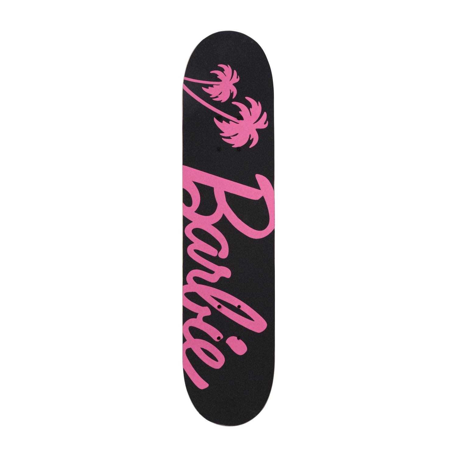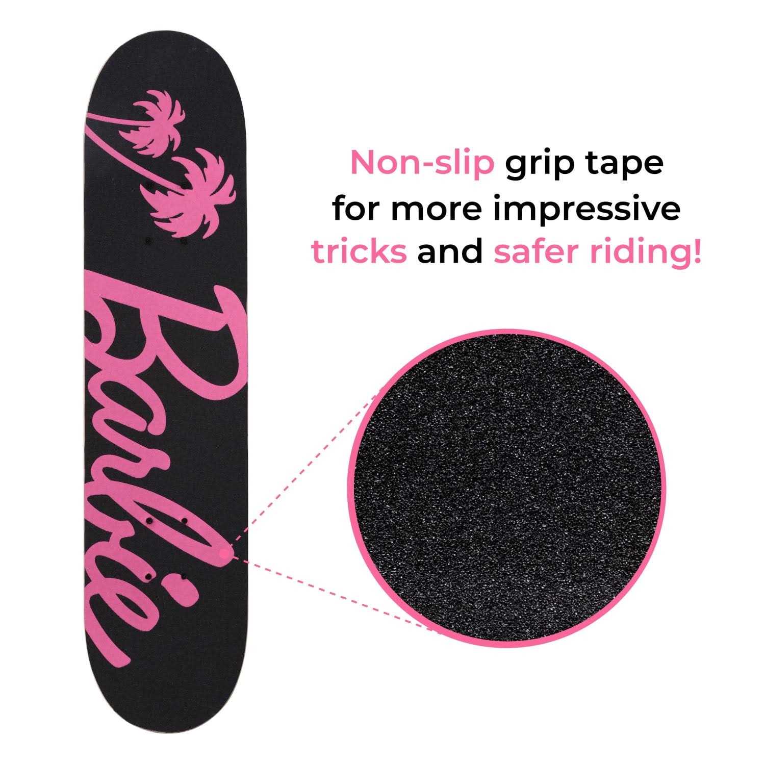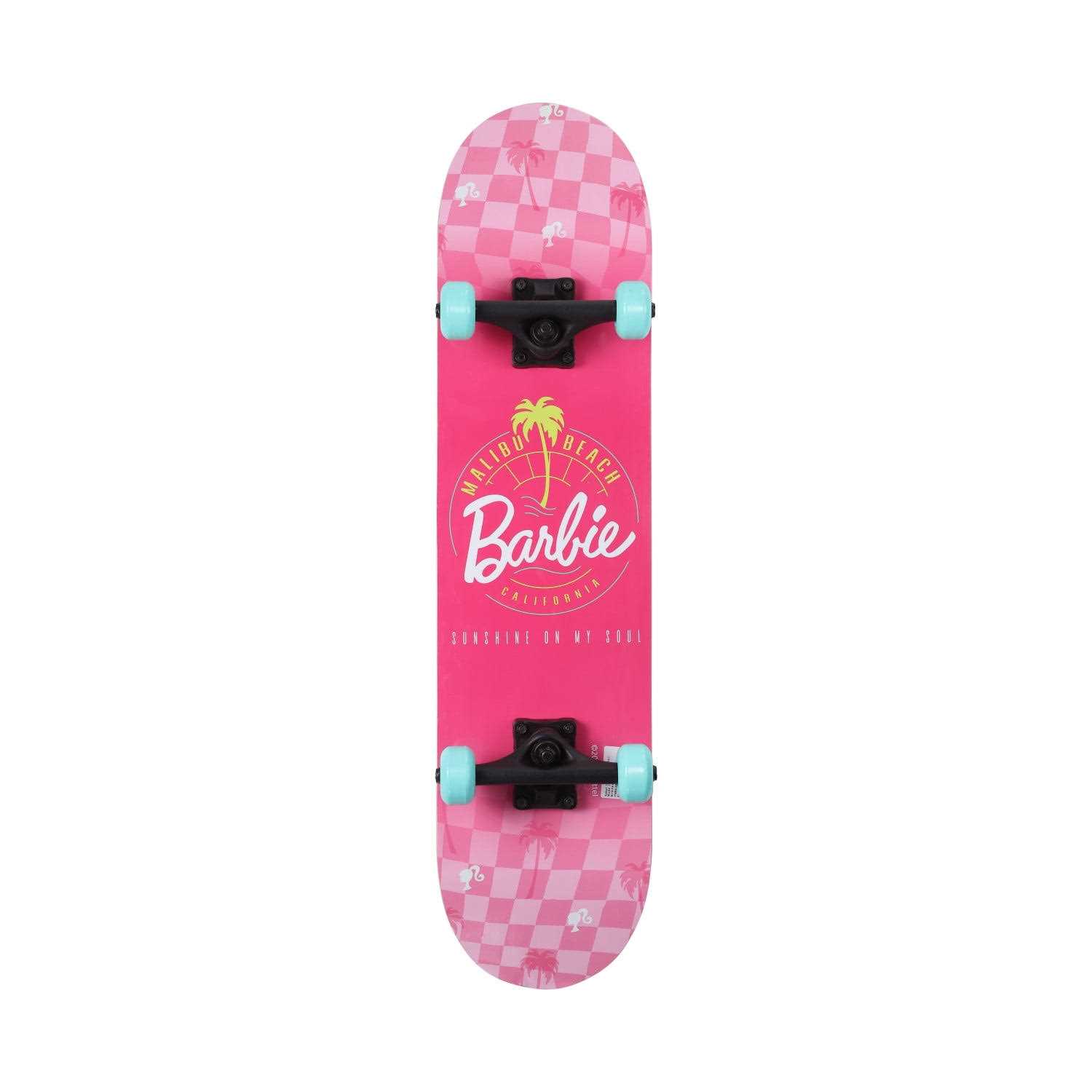 Roll out in style with the Barbie Pink Checkered Malibu Beach 31 inch Skateboard! Fresh off the success of the recent Barbie movie, this skateboard lets young fans bring the vibrant, glamorous world of Barbie to their local skatepark. This skateboard features a sturdy 31 inch x 7.5 inch maple deck adorned with a pink checkered design, an iconic Malibu beach scene, palm trees, and the stylish Barbie logo. The eye-catching design captures the spirit of Barbie while adding a touch of Californian beach chic. The 50x30mm wheels provide a smooth ride, while the lightweight composite pro trucks and ABEC 5 bearings offer excellent control and speed. The pro black grip tape ensures a secure and stable ride, making this skateboard perfect for beginners and fans of Barbie. Whether you’re cruising the beach boardwalk or practicing tricks at the skatepark, the Barbie Pink Checkered Malibu Beach 31 inch Skateboard offers a fun, exciting way to enjoy the outdoors and show off your love for Barbie!