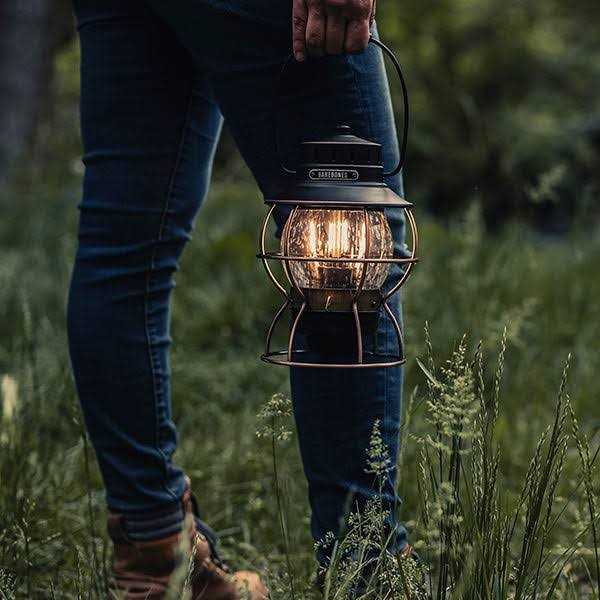 Barebones lantern railroad lantern A modern twist on an antique and popular Union Pacific lantern. Beautiful seed glass and copper accents make it a unique lamp for a neat dining table at home or while camping. This functional, high-tech lantern operates on battery or USB for more than 100 hours on low or 3.5 hours on high. Edison-style LED bulb with adjustable brightness provides a classic warming glow perfect for any occasion.