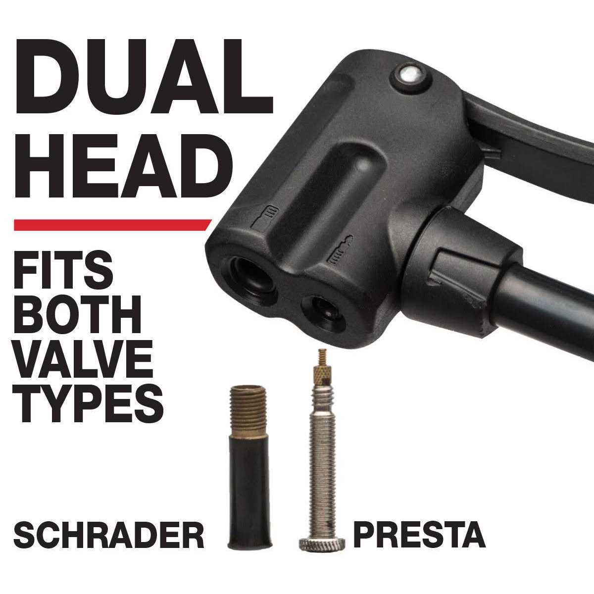 - Dual Schrader/Presto pump head – Extra-large handle and base