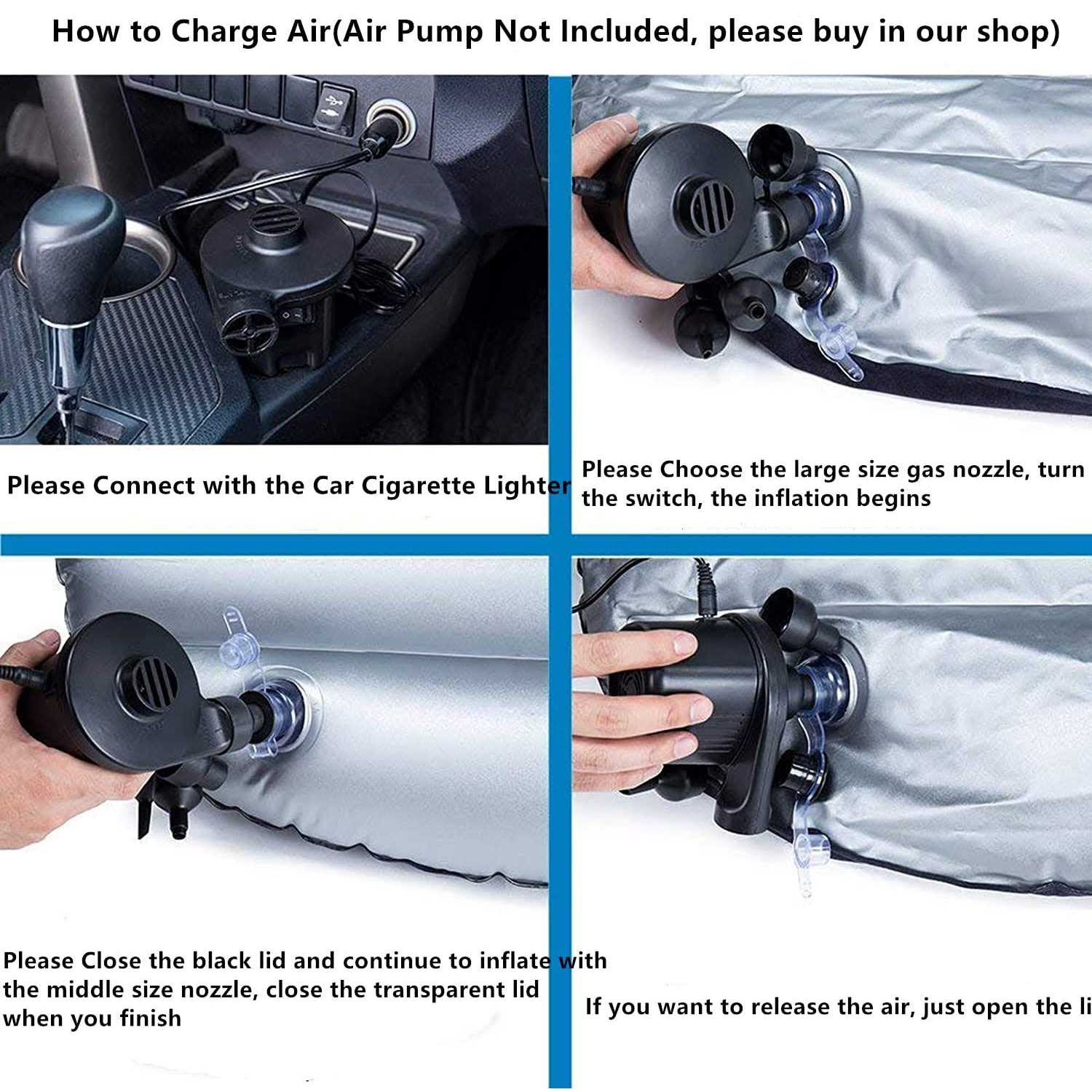 Please search Asin “B07WSZTZM5” in Amazon if you need to buy an air pump. Dimensions: 130*27*38cm(51.2*10.6*15inches) after inflation, fit for most household sedan and some SUV, can hold up to 300kg (661 pounds), product weight: 0.7kg. It is 25 Below Zero cold-resistant outdoor mattress pad, can be used under any weather outdoor indoor with precise seaming Durable and Comfortable: Berocia Air Gap Pad is made of high quality 6P thickened PVC with CE RoHs certificated (Berocia always and only choose environment-friendly premium PVC which is good for human health) and superior flocking material, turns your car back seat into a travel bed which is extremely soft and comfortable, easy to clean Quick Inflation(only need seconds) and Easy Store: with cigarette lighter air charger included, the pad can be finished charge air in Seconds, no more than 1 minute. Only 0.7Kg, easy to carry and store for travel Safe Car Sleep and Play for Kids Pets Adults: When you sleep in the car backseat during long-distance driving , inflating it to fill the gap between the rear and the front row, you will not worry about the roll problem (especially for kids) Package included: Car Gap Pad, Electric Air Pump(not included), 2 PVC Repair Patch(you can easily fix it with PVC glue(not included) if you cut the pad not carefully Note: 1. Electric Air Pump(not included) 2. Please do not make it touch cigarette or any sharp objects. 3. 2 PVC Repair Patch(you can easily fix it with PVC glue(not included) if you cut the pad not carefully 4. If no one lies on it, the air inflation can stay for one week, if people lie on it, need charge air again in 3-4 days usually 5. This product can not be used in water for its flocking surface, it can get clean very easily with a wet towel Package Includes: 1x Gap pad 2 x PVC Repair Patch 1*Portable Carrying Bag