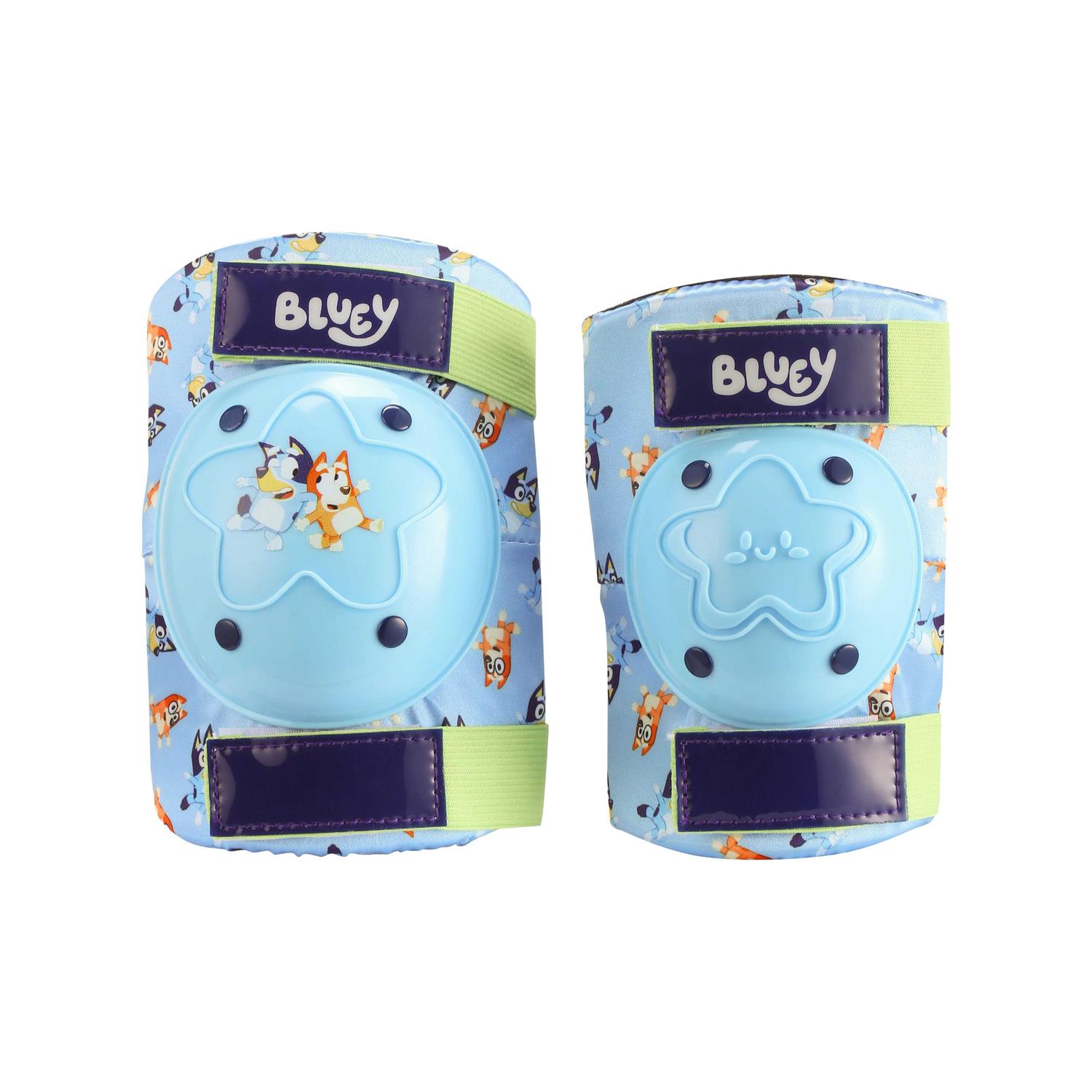 Look cool and ride safe with Bluey Protective Pads! The kids knee pads and elbow pads that are designed to absorb impact and that are padded with EVA comfort foam. Perfect accessory to keep kids safe when riding bikes, scooter, skateboards, or roller blades. With tear-resistant material these pads will ensure you will ride smart and secure! Ride with your best friend Bluey and the protective pad set also comes with a bonus bell!