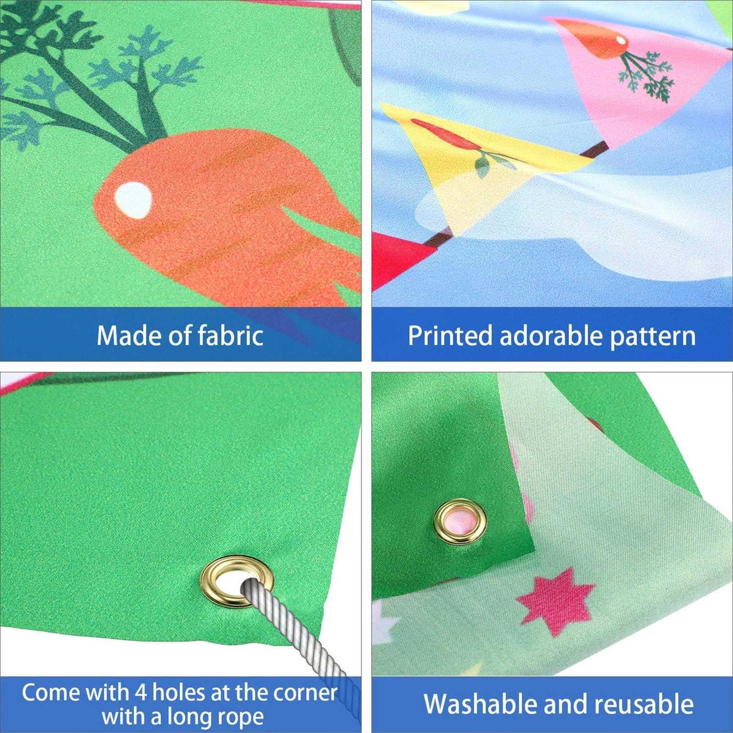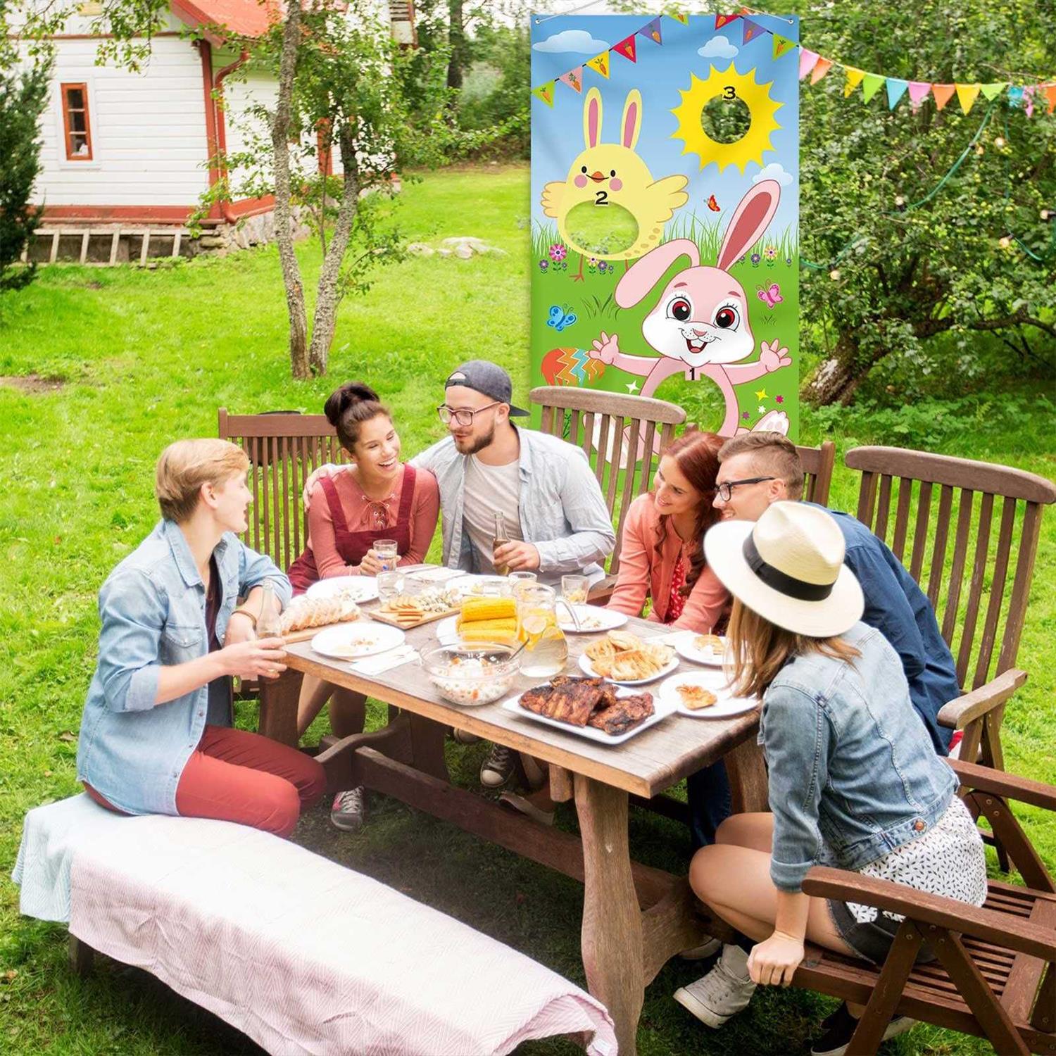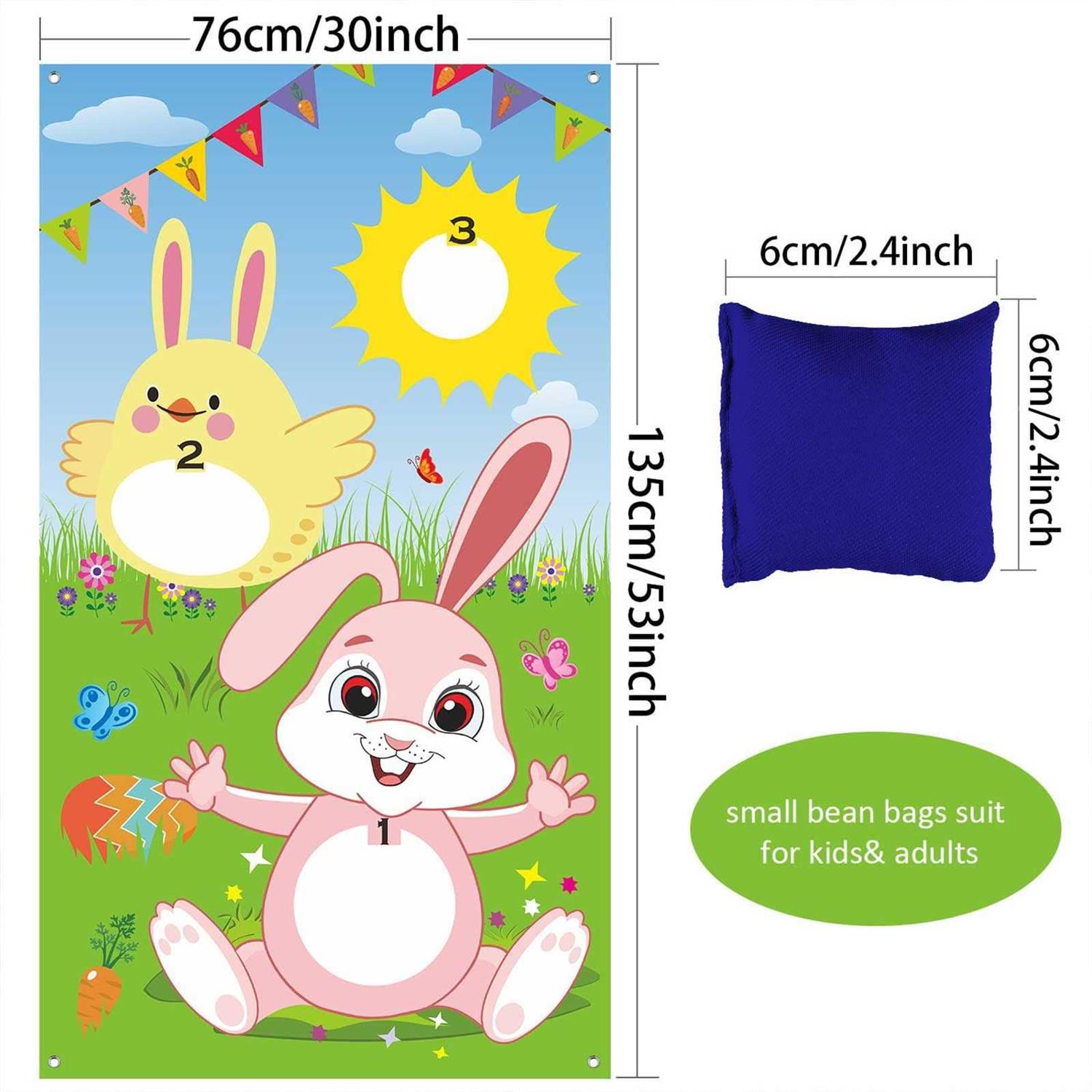 Package includes: 1 fabric Easter toss game banner, 3 bean bags and 1 ribbon (approx. 9.8 ft) for hanging; Funny Easter family game set for both children and adults Material and big size: the Easter banner is made of fabric, installed 4 holes for hanging easily; The Easter game banner (30 x 53 inch) is larger size than traditional toss games, suitable for multi-team competition Funny Easter party supply: this Easter egg hunt game set is great for children and adults; It can train and promote children’s hand-eye coordination and team spirit as well as basic math skills while playing this fun game; Great for Easter party, indoor and outdoor activities Washable and reusable: hanging style, fabric material, convenient to store and carry; Great Easter game can be applied all the year round Great Easter decoration: this Easter party game banner is printed with cute bunny, chick and Easter egg, great sun light and blue sky give the Easter toss game banner full of festival feeling, suit for Easter home decoration both indoor and outdoor br Easter toss games with 3 bean bag, fun Easter game for children and adults in Easter party activities, great Easter decorations and supplies br br Package includes: br 1 x Fabric Easter toss game banner (30 x 53 inch) br 3 x Bean bags (2.7 x 2.3 inch) br 1 x Ribbon (approx. 9.8 ft L) br br Features: br 1. Cute design toss game: these Easter toss game features a blue and green background with cute Easter rabbit, chick, Easter egg, and sun. br 2. Funny Easter party game supply: add more memory at your Easter Day, add fun for home, school, backyard, beach or wherever you might be traveling. br 3. Washable and reusable: made of high quality fabric, convenient to store and carry br 4. Great Easter party decoration: suit for decorating indoor or outdoor, to Easter party, spring party, family friendly party, group activity and so on. br br How to use: br 1. Player stands some distance in front of the hanging game banner and with bean bags in hand. br 2. Toss the bean bag through the open holes in the banner, each player gets 3 chances. br 3. 3 Points are awarded for the top hole, 2 points for the second hole, 1 point for the lowest hole. br 4. Player with most points wins. br br Attention: br Due to the problem of packaging, there may be creases that can be ironed on the back of the product. br Winding risk may exist, children under 12 years old should use this product under adult supervision.
