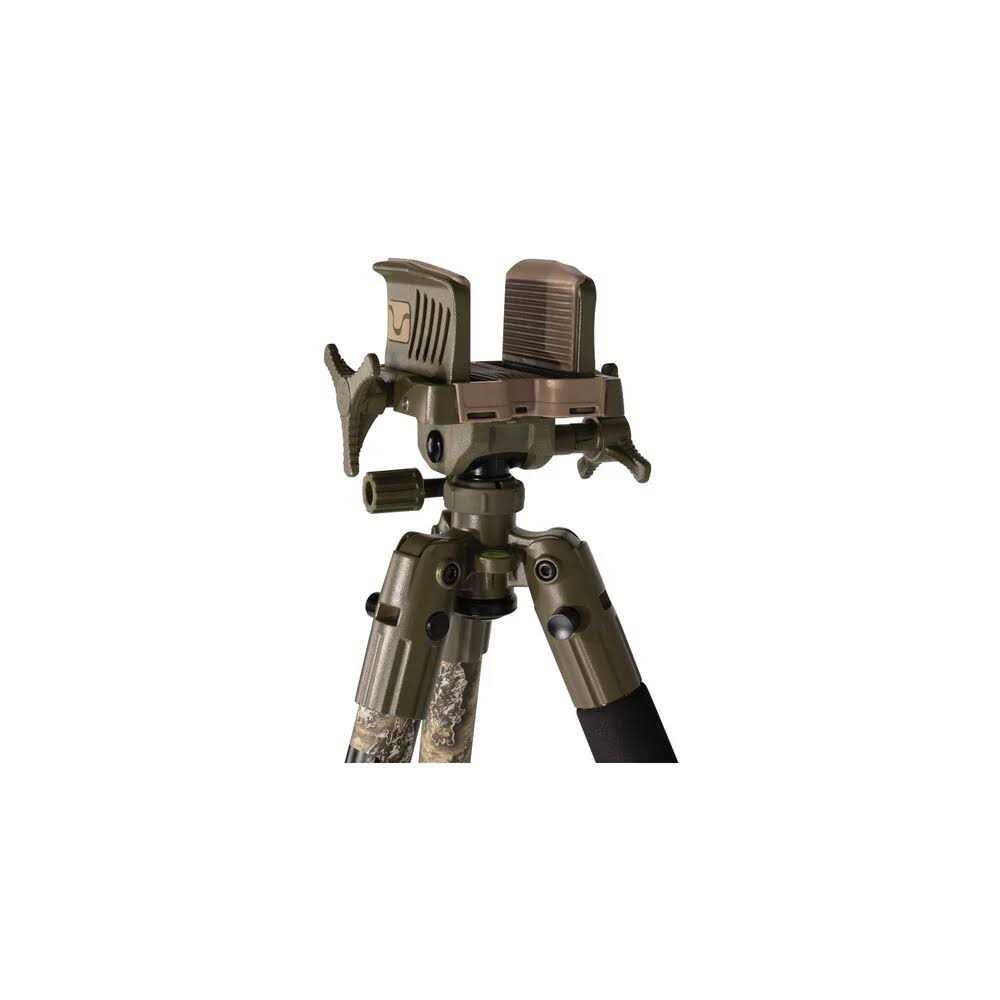 The Battenfeld BOG Deathgrip Carbon Fiber Tripod is engineered to be the most stable shooting platform on the market. Carbon fiber is 15 percent lighter and 17x stronger than aluminum. It secures any weapon for hands-free use and features an integral bubble level. Retractable steel spikes secure into virtually any terrain. The three-position leg lock is great for prone, kneeling, sitting and standing positions. It also features up to 72 inches of height adjustment.