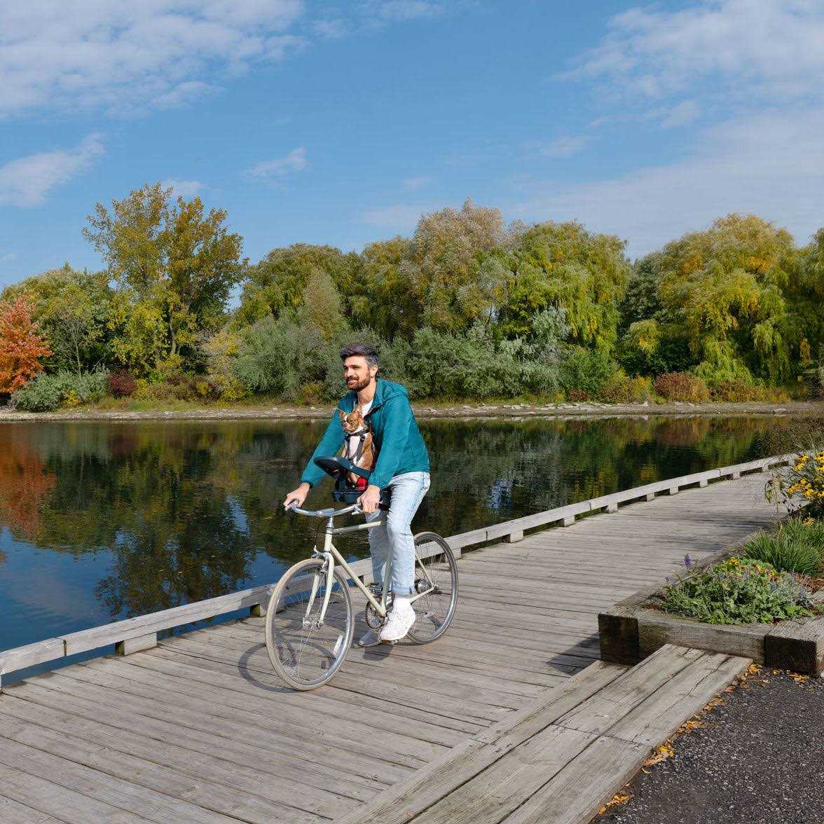 Buddyrider Dog Bicycle Seat lets you safely take your dog on bike rides. The secure Buddyrider dog bike seat attaches over the most stable part of the bike making it far more stable than dog bike baskets while still allowing your dog to have an up-front view unlike dog bike trailers. The BuddyRider dog bike seat is made of the same sturdy materials that child bike seats are and mounts securely to the frame. No sagging like dog bike baskets and other flimsy dog bike carriers. Take your dog for a safe bicycle ride with the BuddyRider.
