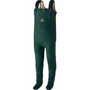Comfortable green stocking foot neoprene waders with adjustable suspenders, fleece line handwarmer pocket and sliding gravel guards. Works great in colder weather to keep you warm and comfortable while fishing, clamming or working in your pond. The feet are double taped glued and stitched to make sure your feet stay warm and dry. This family of waders has a size for most everyone including men, women and youth in most body sizes.