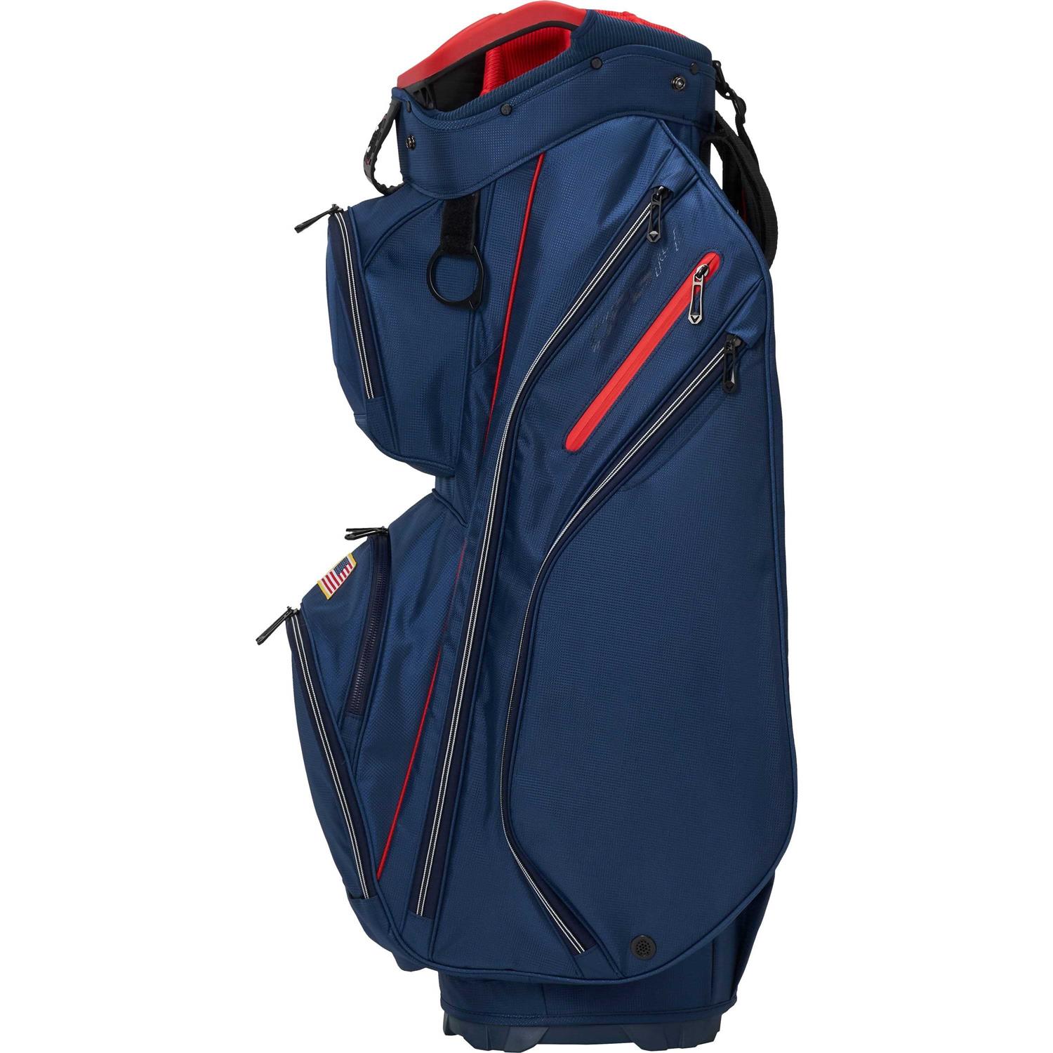 Organize and carry your clubs with the Callaway Org 14L cart bag. It features a 10.5 inch 14way top with full length club dividers that separate and protect your clubs. The top also includes 2 integrated molded grab handles for easy lifting. The cart bag is equipped with 10 pockets, which include 2 insulated cooler pockets and a velourlined valuables pocket that is waterresistant and includes a key fob. The Org 14L cart bag also includes an integrated umbrella sleeve and an Etrolley base system.