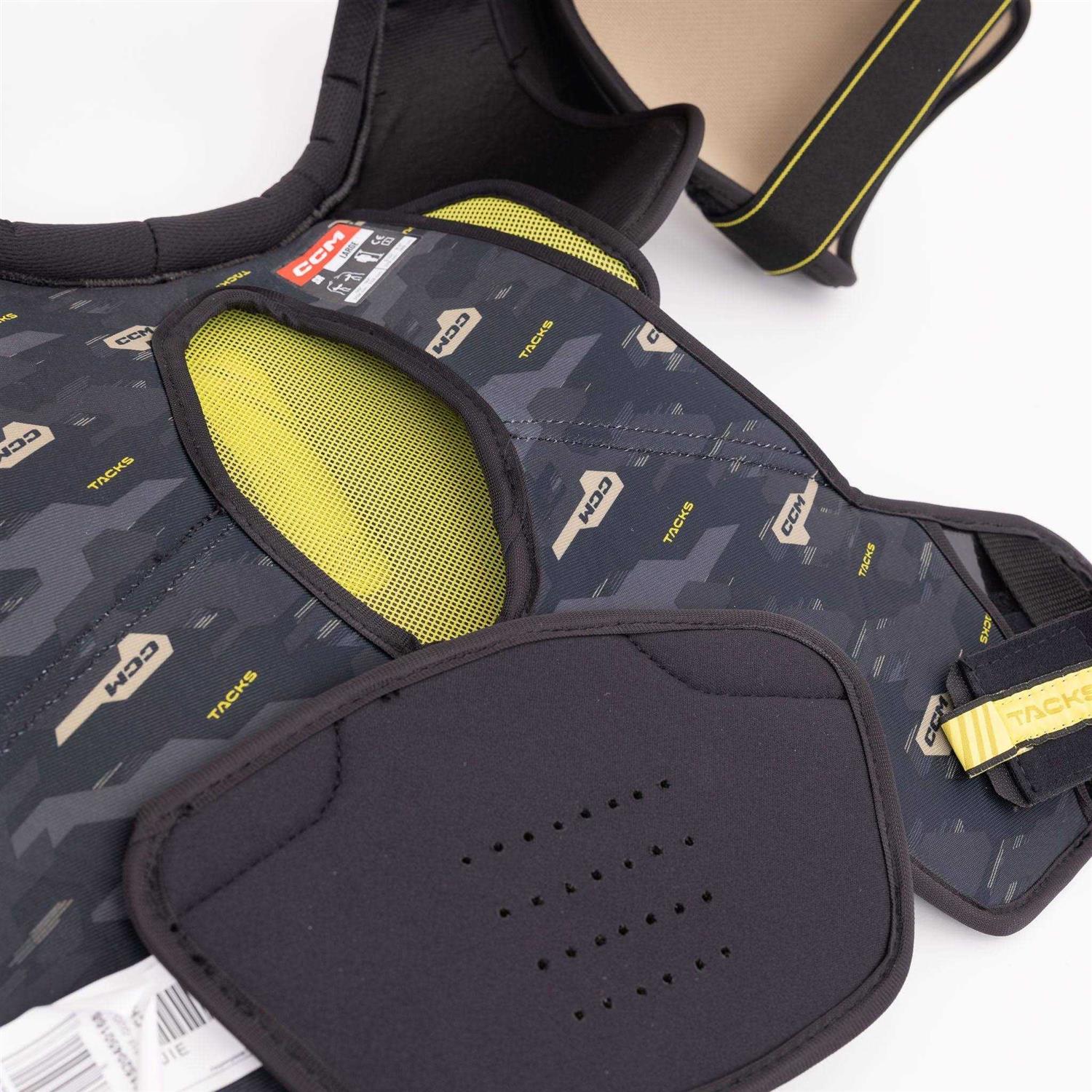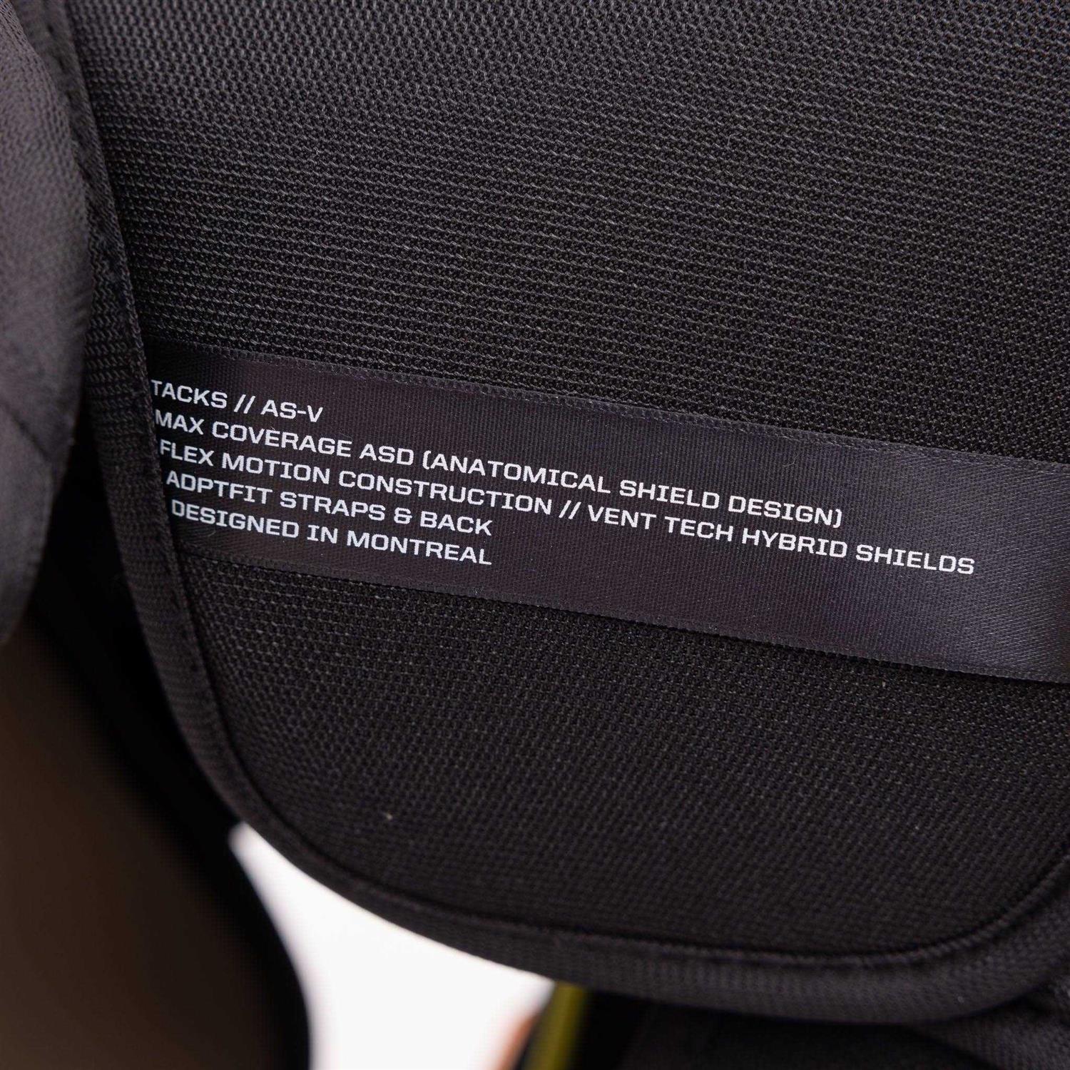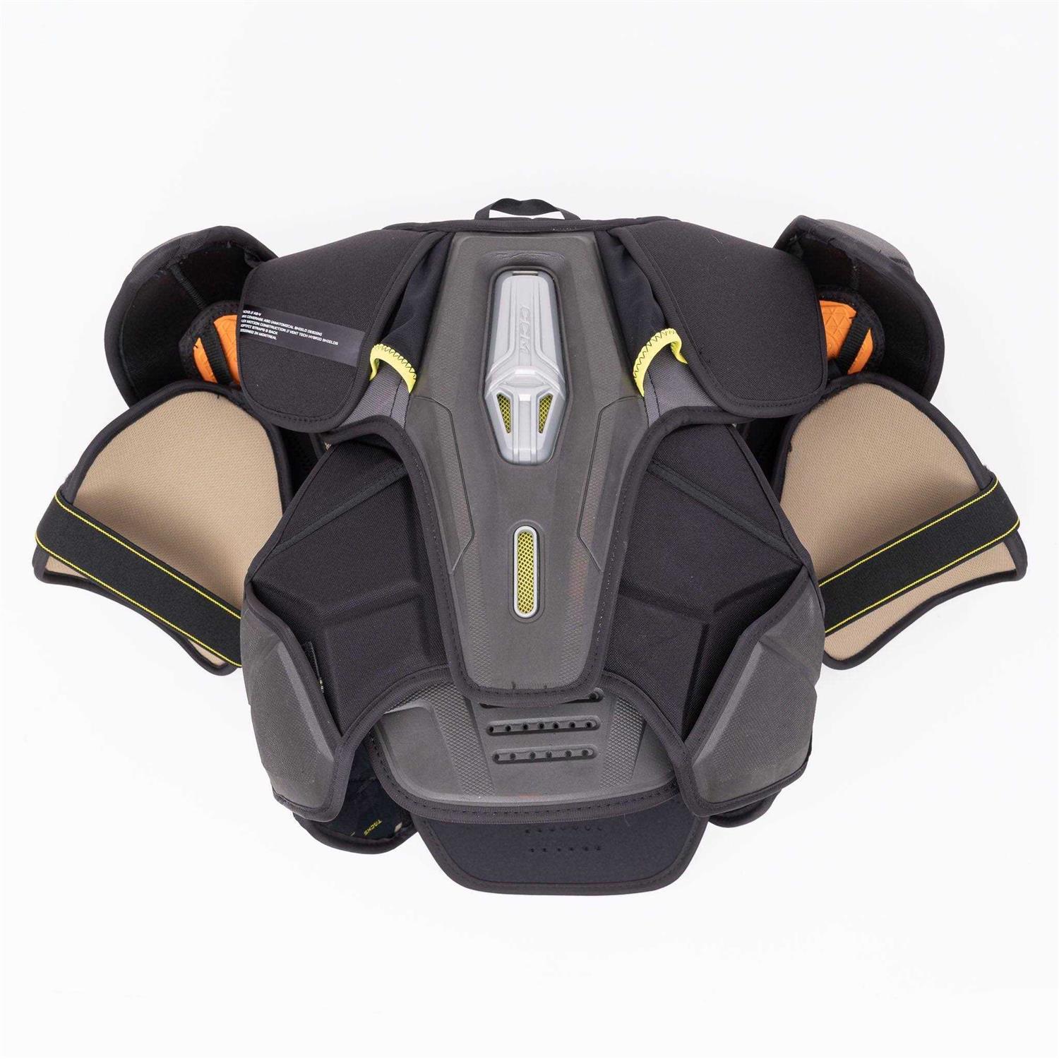 Tacks AS-V features D3O smart material in many areas of the shoulder pads, providing premium impact protection and shock absorption. In the shoulder caps, D3O and JDP cap construction disperse the force of impact away from the shoulders to provide excellent impact resistance. Molded MD EVA foam for kidney coverage and floating sternum coverage, protects you as you move. CCM uses their removable belly and lower back pad, for added torso protection and also provides customized comfort. CCM uses a sublimated liner with dual layer stretch panels, designed for maximum air flow and mobility. This high-tech liner keeps the pads light while you stay cool and dry throughout the game.