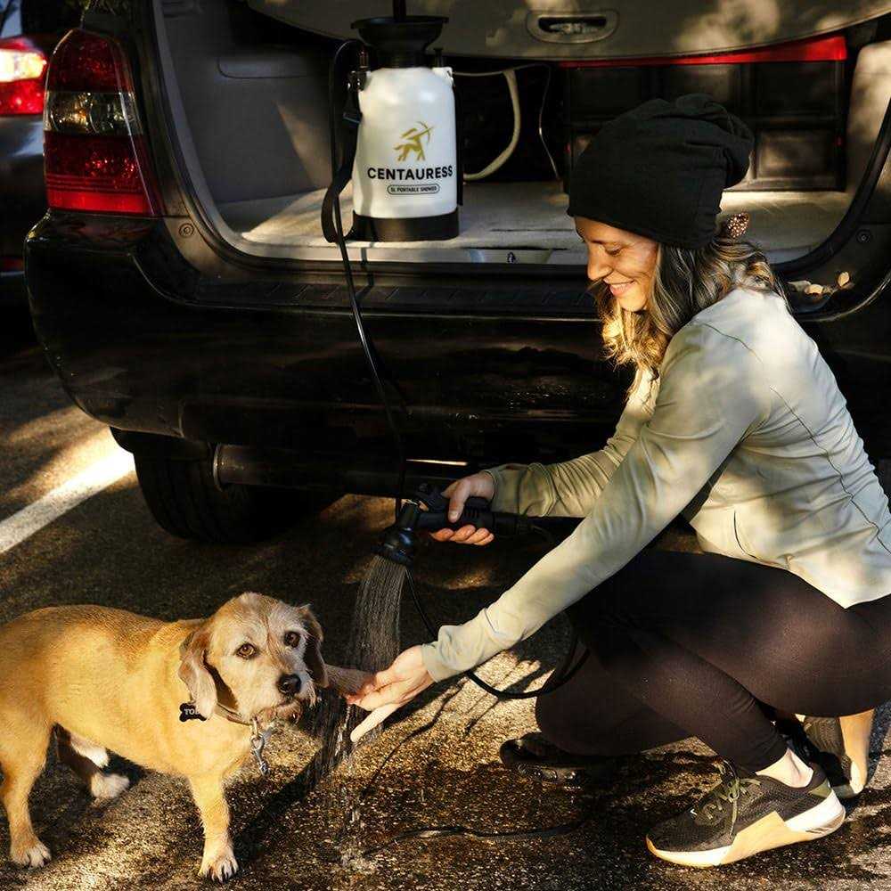 Centauress Portable Camp Shower: Our 1.3gal/5L portable water tank with pump, constructed with high-density polyethylene ensures long-lasting performance. With a 5ft 6in hose and 8 nozzle settings, you can enjoy a refreshing outdoor camping shower experience anywhere. The included shower holder keeps the nozzle clean and ready for use. You can bid goodbye to worries about tipping over on uneven surfaces with our portable showers. The stable base design with a unique bowl bottom ensures you can enjoy a hassle-free outdoor camping hot water shower, even on challenging terrains. Carrying your car shower has never been easier. The comfortable shoulder strap allows for hands-free transportation, whether the portable outdoor camping bath shower is empty or full. You are no more struggling with one-handed carrying. Take your outdoor shower pump wherever you go with ease. Providing you with a safe experience is our priority. The built-in safety valve of the shower pump for camping ensures pressure release when it reaches the 45 PSI limit, promoting safe and worry-free use. Maintain your hygiene during your camping, hiking, or outdoor activities with the included camping shower head holder. Keep your shower head clean and readily accessible, eliminating the need to place it on dirty outdoor surfaces. This polyethylene bottle is an ideal accessory for camping, hiking, beach trips, or any outdoor adventure where a refreshing shower is desired. Our outdoor shower kit can also be used for a comfortable dog shower, road shower, after beach rinse, mountain bike wash or boat cleaning. This outdoor portable shower is an effort to do just that.