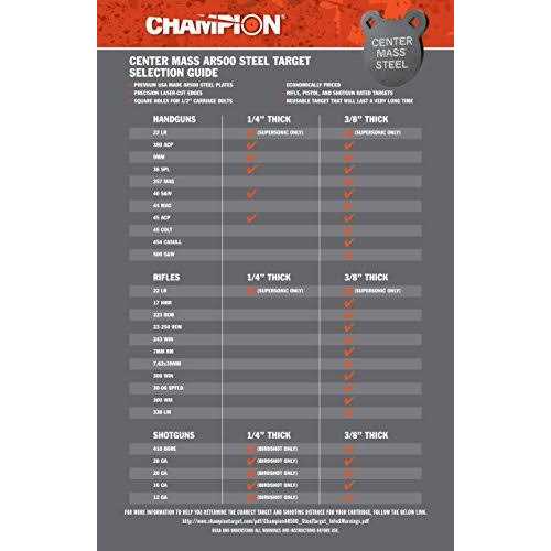 Nothing beats the instant feedback and satisfying ‘ping!’ when a well-aimed shot hits a steel target. The new Champion Center Mass Ar500 Steel Targets are designed for years of fun at the range. The Ar500 Steel is hard enough to withstand multiple calibers at the appropriate distances. The targets also come in three different shapes and sizes, allowing for a customizable shooting experience. Hearing is believing with Champion Center Mass Ar500 Steel Targets. Laser cut edges with square holes for 1/2″ carriage bolt.