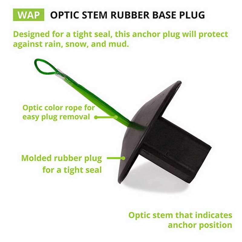 Molded rubber base plug with optic stem that indicates anchor position. Also comes with optic color rope for easy plug removal. Fits all conventional male & female base anchor systems.