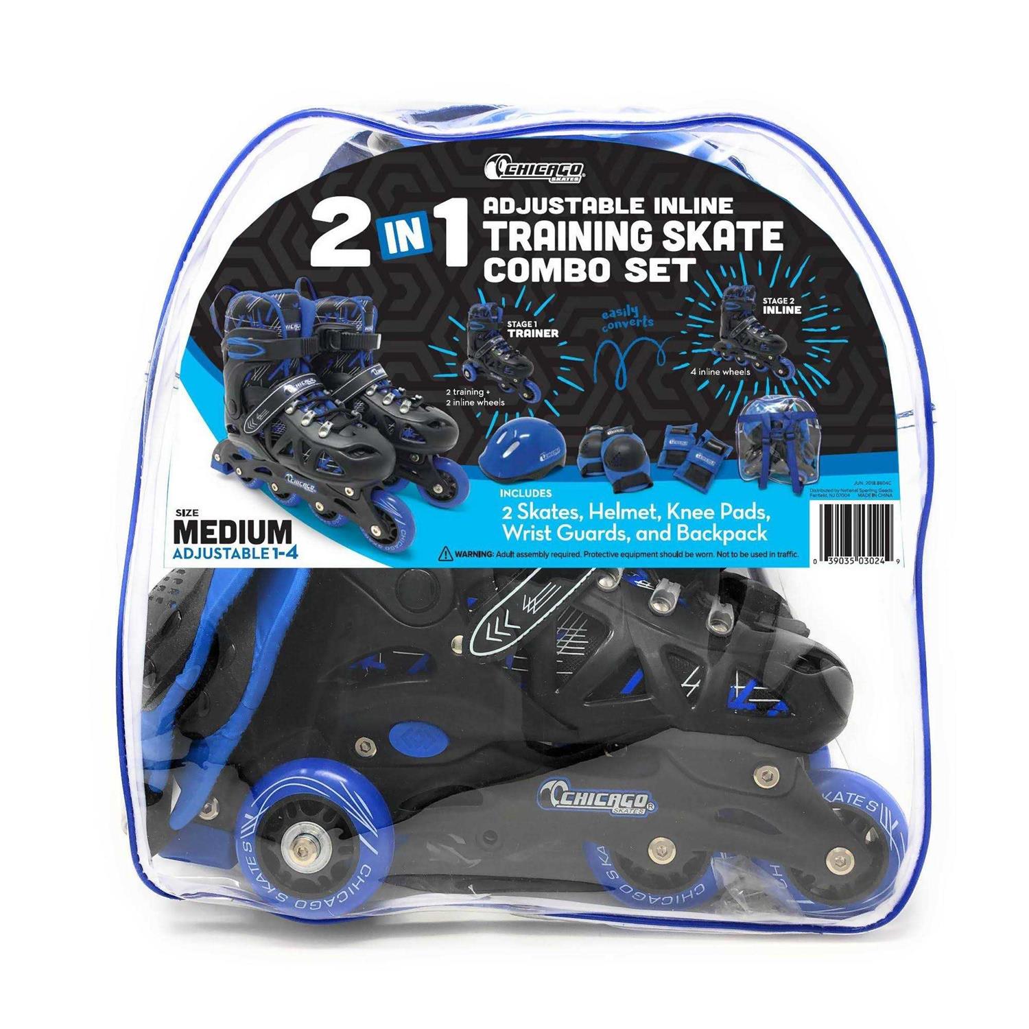 Start your little one s training out right with the Chicago Skates 2 IN 1 Inline Training Skate Combo Set. This set includes a pair of convertible skates, a safety helmet, wrist guards, kneepads and a backpack to carry it all. The skates adjust 4 different shoe sizes and easily convert from trainer to inline skates to take your little ones through the learning curve of skating even as they grow. Equipped with laces, ankle strap a an easy-adjusting micro ratchet buckle, these inline skates secure firmly onto the feet and stay on tight even under strain. The inner boot is comfortable and cushions legs to absorb the stress of skating. The durable and sturdy construction with 64mm wheels and 608z ball bearings will keep your little skaters balanced as they smoothly glide along.