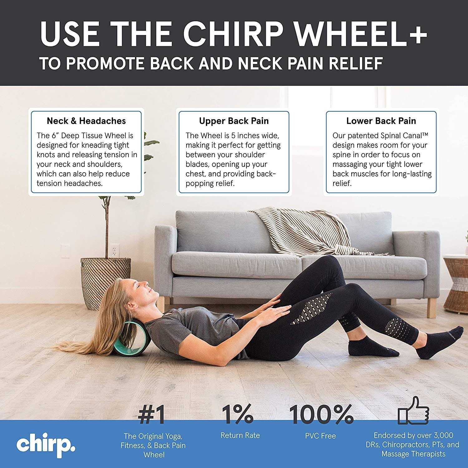 The 6′′ Deep Tissue Chirp Wheel+ helps reduce back pain by decompressing your spine, strengthening core muscles, and massaging out tight trigger points. Made with a rigid ABS plastic core and soft EVA compression sensitive mat, the Chirp Wheel+ can support up to 500 pounds! The 6′′ Deep Tissue Chirp Wheel+ offers a deep tissue massage to knead out tight muscle knots along your spine and leave you feeling great. Offers Back Pain Relief The 6′′ Deep Tissue Chirp Wheel+ helps reduce back pain by massaging the muscles along your spine, correcting poor posture, and decompressing your vertebrae. The spinal canal provides a 4-way stretch and protects you from unsafe spinal pressure. Built Strong The 6′′ wheel has an injection molded, rigid core that was tested to support up to 500 pounds! The Chirp Wheels are also built with a soft EVA compression sensitive mat so rolling out is comfortable. Strengthens Muscles while Improving Posture Rolling out on the 6′′ Chirp Wheel+ will help improve the natural curvature of the spine. Incorporating the Chirp Wheel+ into your daily routine will help strengthen the muscles surrounding your spine and may help relieve pain from disc issues. Reduces Muscle Strain The 6′′ Deep Tissue Chirp Wheel+ offers a deep tissue massage to target hard-to-reach muscle knots. It can also work as a posture corrector. Place it in the small of your back while sitting down for a gentle reminder to sit up. Easy to Use Anyone can use the Chirp Wheel+. Use the wheel on the ground, against the wall, or in a chair. The ergonomic shape of the wheel will help reduce back pain and correct poor posture however you use it.