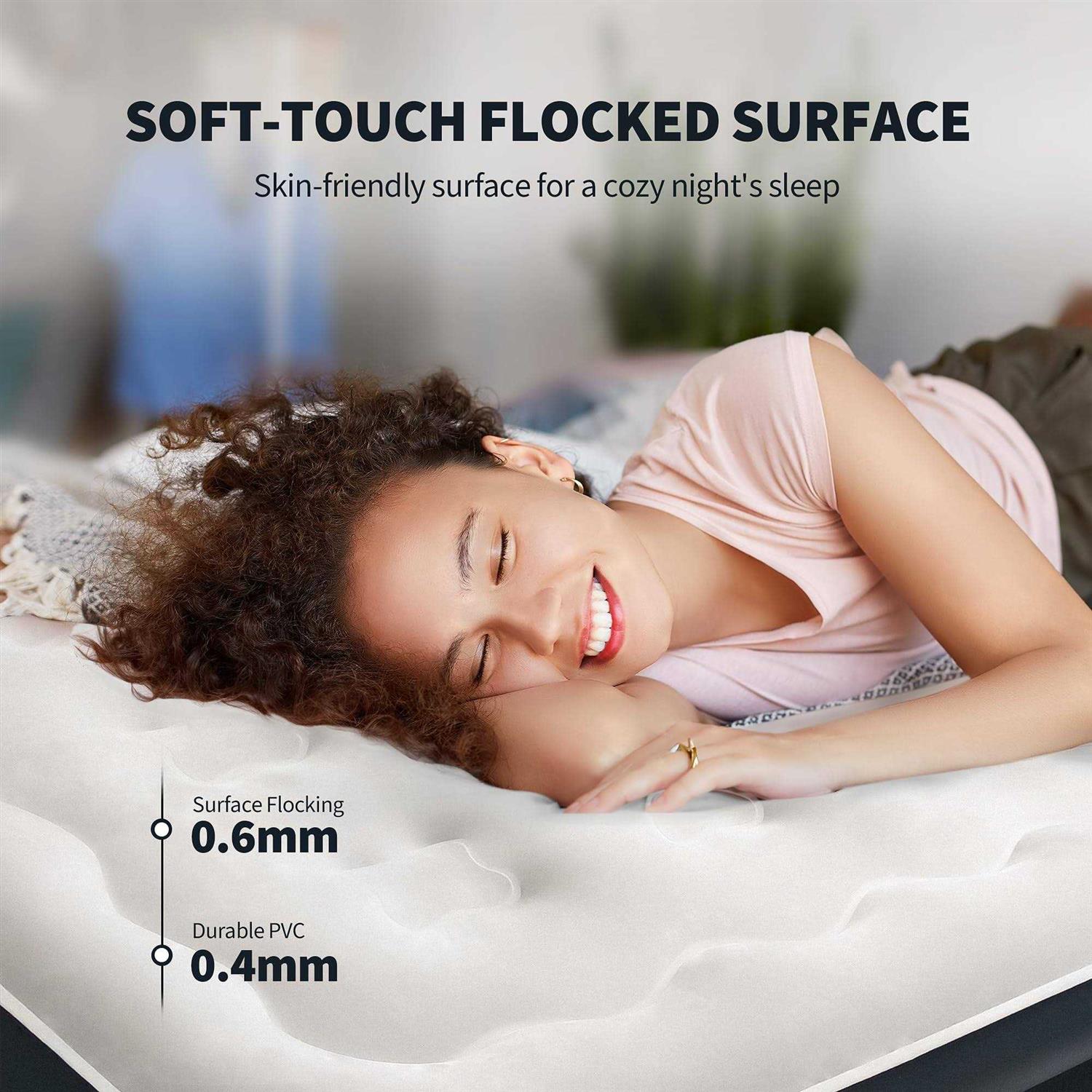 SUPERIOR FULL BODY SUPPORT & COMFORT: The Cirtek 18-inch queen air mattress inflates to 80x60x18 inches and can support up to 650 pounds. The inflatable mattress offers excellent head-to-toe support. The raised edge design increases the stability of the queen size air mattress. The flocked surface’s soft, skin-friendly texture provides the utmost comfort for a sound sleep. HIGH-QUALITY & DURABLE MATERIALS: Thickened PVC material and premium top-layer flocking, sturdy, puncture-resistant, and air leak-proof, go into making this air mattress queen. The non-slip bottom design prevents the inflatable bed from shifting and ensures safety. It can be wiped directly with a damp towel for easy cleaning. Perfect for indoor or outdoor use. MULTIPURPOSE & OCCASIONS: Our blow up mattress has a high-powered external electric air pump, which inflates in about 5 minutes. It’s lightweight and includes a carry bag for effortless storage and portability. Whether camping, traveling, accommodating guests, office, or simply needing a comfortable, temporary bed, our air bed ensures you enjoy a restful night’s sleep. A PREMIUM GIFT: Christmas and New Year’s Day are rapidly approaching. The air mattress will be a practical and unique gift if you have family and friends who like camping, traveling, or enjoying the outdoors. The airbed set includes an 18-inch air matress, a handheld electric air pump, a carrying bag, repair patches, and a user manual. Every camping air mattress from Cirtek undergoes a rigorous 24-hour air tightness test before shipment. Warm tips: Be mindful of weather changes; the inflatable mattress will soften when the temperature drops, based on thermal expansion and contraction principles. More air needs to be added at this time. Cirtek 18″ Queen Air Mattress with Carry Bag and Blow up Air Pump EXTRA-DURABLE AIR MATTRESS: Made of polyvinyl chloride, our queen inflatable air mattress is extra-sturdy and won’t get easily ripped on rough terrain. It is strictly tested for durability, overnight leakage, and performance, and makes a reliable camping blow up mattress or RV raised air bed. SKIN-FRIENDLY AIRBED MATTRESS: With a 0.6mm flocked top, this air bed mattress is soft and comfortable, providing a quality sleep experience for families, couples, and individuals. A SPECIAL GIFT: Are you anxious about finding unique holiday gifts for your friends and loved ones? No need to worry; this luxury air mattress bed is perfect. It is comfortable and easy to inflate and will not leak during use. It is a good New Year, Christmas, Valentine’s Day, or birthday gift. REMINDER 1. After inflating the air bed, please turn off the pump and seal the valve completely. 2. When the air pump runs for about 10 minutes, it will generate heat. Allow it to cool down for approximately 3-5 minutes. If it does not work for a while, keep it cool and wait for the temperature to drop. 3. STRETCH – At first inflation, the material will STRETCH, sometimes misinterpreted as leaking. You will sense a loss of pressure, just the bed stretching. Re-inflate the air bed again; the air mattress will fully settle within 2-3 nights. SPECIFICATIONS: ❶ Power: 110V ❷ Item Weight: 13.7lb ❸ Product Size: 80 x 60 x 18in ❹ Folded Size: 13 x 6.7 x 16.9in ❺ Load-bearing: 650Pounds WHAT YOU GET: 18in Queen Air Mattress x1 Air Pump(110V) x1 User Manual x1 Carry Bag x1 Repair Patches x2