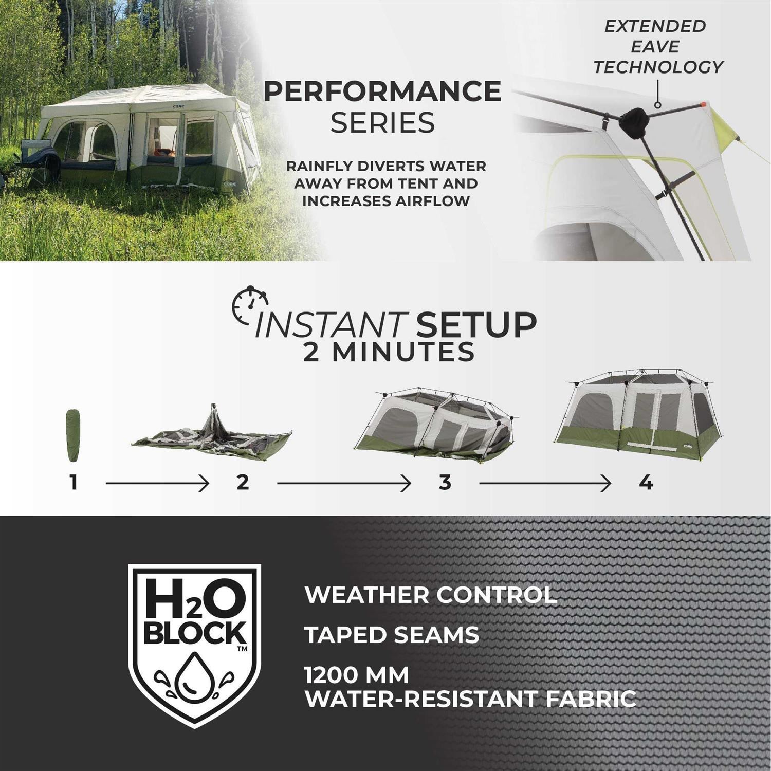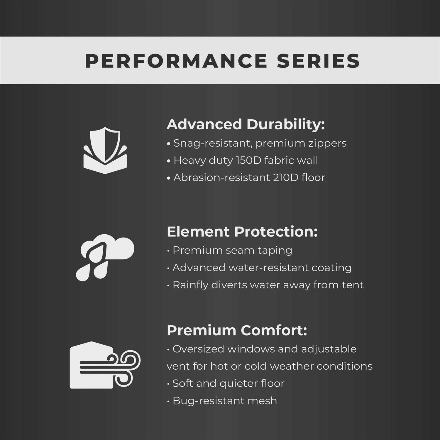 Get outdoor more with our CORE Performance Series tents. These instant tents feature extended eave technology, which lifts the rainfly slightly up and away from the tent, increasing airflow and diverting water runoff from the tent body. They’re also equipped with heavier wall and floor fabric, advanced water repellency, durable snag-resistant zippers, and no-seem-um mesh windows and ceilings to keep bugs out. Like all of our instant tents, the Performance Series tents feature our Instant Hub Technology and pre-attached poles which makes setup as easy as 1-2-3.