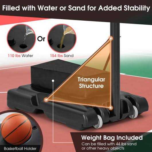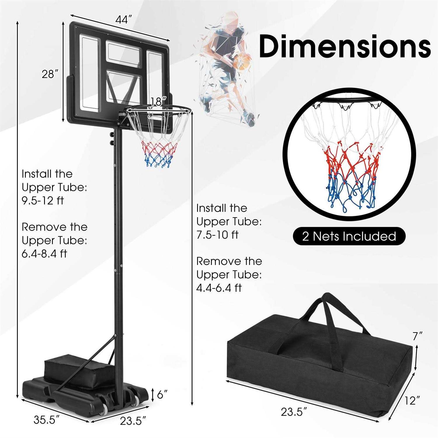 Specifications: Color BlackMaterial Metal + HDPE + PE + PVCAdjustable Height Range 4.25 ft-10 ftDimension of Base 35″ x 23″ x 5.5″Size of Backboard 43.5″ x 29.5″Diameter of Rim 18″Net Weight 43 lbs -Comes with 2 weather resistant nets -Convenient to store the basketball on the base -Easy to move with 2 built-in wheels