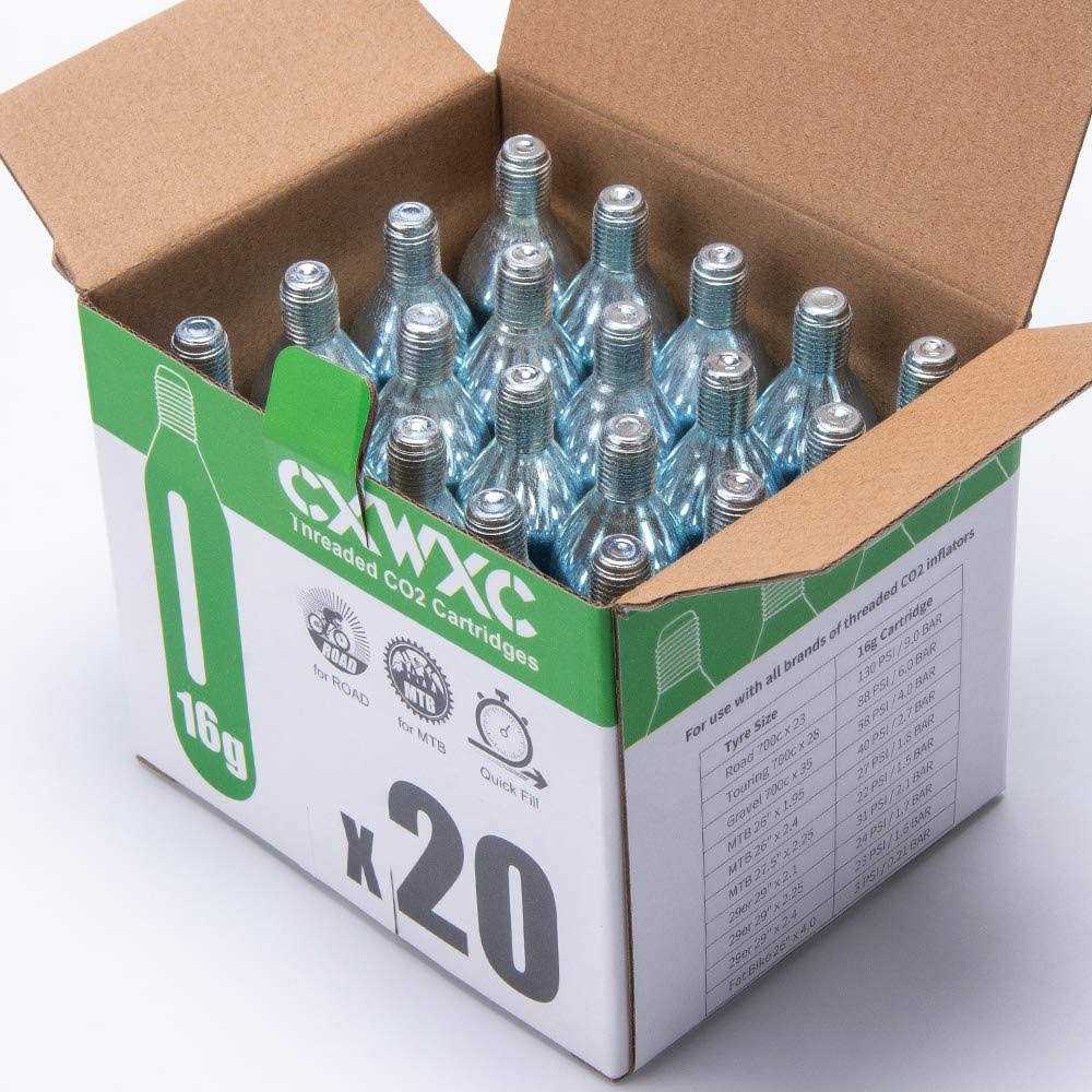 CO2 Pumps by CXWXC. Details:The CXWXC CO2 Cartridges are a new standard of threaded CO2 Cartridge, perfect for whether your going on tough mountain range rides, or in need of fast air pressure during hot pursuit racing! With the 16g threaded cartridges, it can fill a large (26” x 1.95”) MTB tire to 40psi (2.7bar) in a single shot, now that’s impressive!