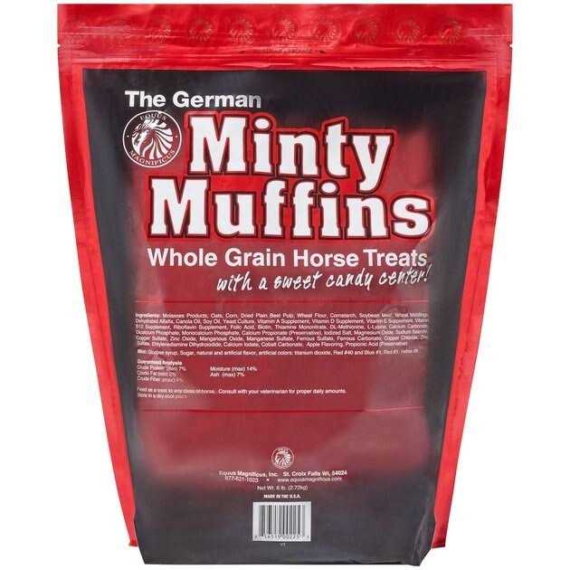 All-natural horse treats with a sweet candy center Horses love these bite sized minty treats Great for training and disguising medications Made in the USA It’s The German Horse Muffin with a sweet, minty center. The German Horse Muffin’s founder was born and raised in Germany, and perfected the German recipe here in the USA. The German Minty Muffin is a sweet and chewy indulgence for horses made from fresh, all-natural ingredients; a decadent blend of sweet feed and molasses. Contain min 8.55% crude protein, min 3.09% crude fat, max 2.2% crude fiber, max 11.89% moisture, max 5.43% ash, molasses products, corn, oats, bran, wheat flour, cornstarch, soybean meal, dehydrated alfalfa meal, vitamins and more. Directions: As a treat – feed as desired while training, riding or anytime. Protect from heat. Resealable bag. Made in the USA.