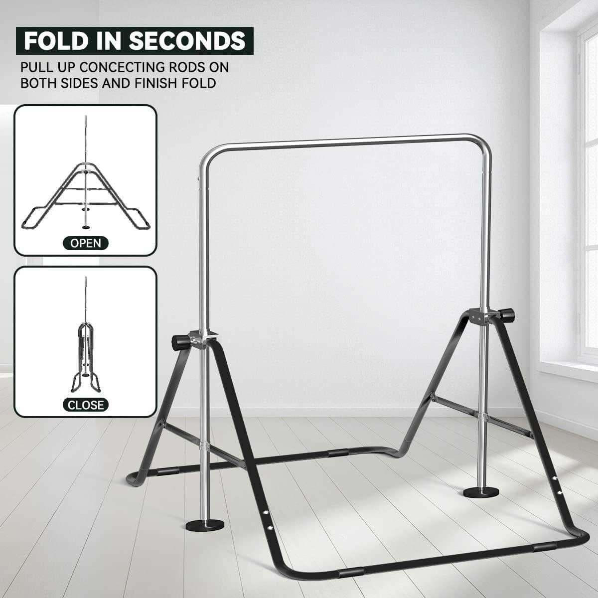 Why Folding Horizontal Bar?-The training on the gymnastics kip bar can not only improve your kids’ balance, but also make the body stretch well while the movement on the horizontal bar to make body become more flexible. Ideal gift for your kids to start their exercise for better body shape! Foldable style makes it easy to carry and store. ADJUSTABLE HEIGHT WITH DUAL LOCK -makes this adjustable gymnastics bar perfect for users of any age and height while the dual lock system safeguards your kids for 100% security. This foldable gymnastics bar equipment perfects for young gymnasts as it can be adjusted to their height as they grow. SAFE AND EXPERT CRAFTSMANSHIP -When it comes to gymnastics equipment, quality counts. Unlike other bars, our Folding Gymnastic Training Kip Bar won’t wiggle or wobble. That’s because our kip bar features a 6-point base and industrial rubber end caps. Ideally suited for gymnasts up to 140lbs, you can rest assured that your future acrobats will train safely. EASY ASSEMBLY -Our professional grade gymnastics bar equipment is super easy to assemble and operate, you can set it up in minutes regardless if you want to use it at home or in the gymnastics arena. Perfect gift for child/teenager/junior’s birthday, Halloween, Thanksgiving Day, Christmas and so on. FBSPORT foldable bar gymnastics for Girls, Boys, Toddlers, Teens Sports Gymnastics Skill Performance Training br br br FBSPORT Gymnastics Kip Bar is the perfect at-home training bar for your aspiring gymnast!