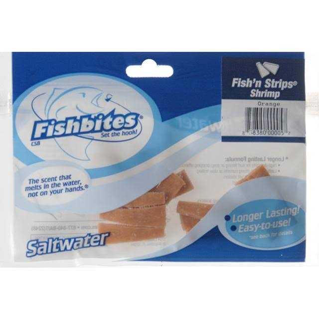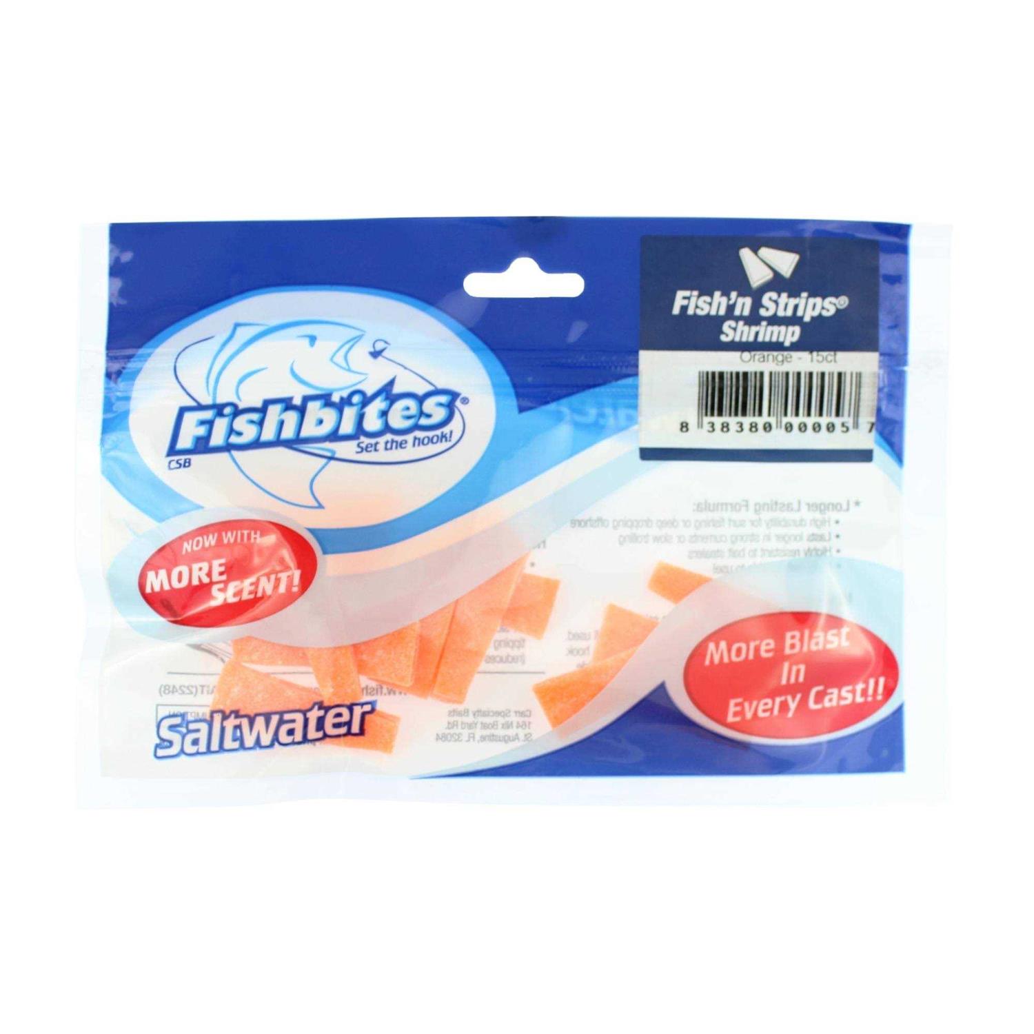 Each bag contains (15) pennant-shaped baits 1.5 L x .5 W (at the base). Fishbites Fishn Strips use our Longer Lasting formula gel that incorporates a mesh in the middle which keeps the bait on the hook cast-after-cast and fish-after-fish. Fishbites Fishn Strips are ideally suited for use with 2/0 and 3/0 hooks. While they can be fished in almost any water temperature, the gel is formatted for greater durability in water temperatures at or above 70F/21C. Fishbites is made with pride in St. Augustine, FL USA. Available in pennant shaped wedges in several colors and 4 scents (clam, crab, shrimp, and sand flea). Fish’n Strips tough consistency make them the perfect bait for surf fishing from the beach, off a jetty, atop a pier, or from the bridge. Fish’n Strips are a must-have, all-purpose saltwater bait.