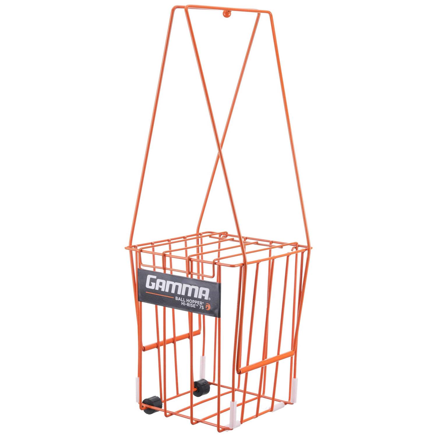 The Gamma Ball Hopper Hi-Rise 75 with Wheels is a professional grade ball pick-up designed for to hold 75 balls with maximum durability and everyday use by teaching pros and players alike. This basket features EZ-Go Wheels and locking handles for even easier pickup and travel. Attached lid prevents accidental spilling. Legs/handles lock in place when convertible basket is in pick-up position. Features wear bumpers on the basket bottom wires that protect against damage. Includes reinforced side and bottom welds for added strength and durability. A Diamond Clad wear resistant coating protects hopper from rust and damage. Floating wires at the bottom of the basket float or roll for easy ball pickup. Floating wires at the ball openings make ball entry easier and eliminate welds that can fatigue and break. *For Tennis balls only. Balls not included.