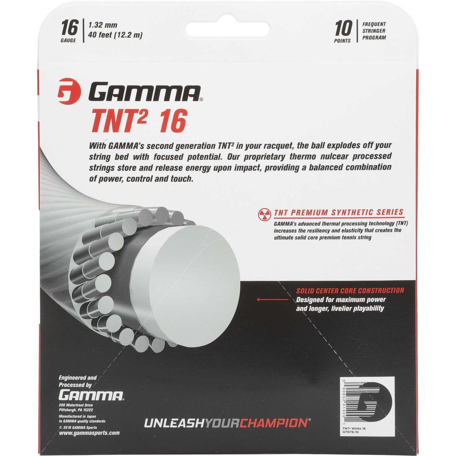 A reinvention of the popular Gamma TNT string, Gamma`s TNT2 encompasses power, feel, and control worthy of the TNT name. The second generation Thermal Nuclear Technology provides greater elasticity for more power and comfort, but with the durability of a solid core construction. TNT2 incorporates an Elastilon 2 polymer core to enhance ball pocketing. This mono-filament central core improves tension maintenance while the outer wraps soften the response to ensure comfort. Gamma TNT2 is one of the most well rounded offerings from a brand synonymous with powerful, and comfortable polyamide strings.