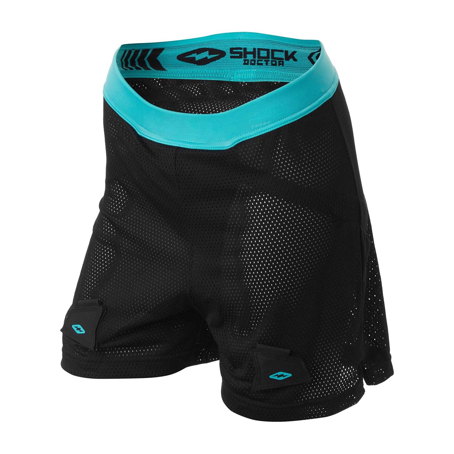 The Shock Doctor loose hockey pelvic short with protector is a mesh, comfort, ventilated short. There are Velcro patches to afix socks. Don’t be afraid to play your hardest with the Shock Doctor Girls’ Loose Hockey Short with pelvic protector. The mid-rise cut short is made of super ventilated mesh fabric with a comfort fit waistband with an integrated pocket that holds the pelvic protector securely. The anatomical design with integrated thermal-formed contour foam allows for low-profile protection and superior comfort. Added features include front and back Velcro patches for ease in securing socks.