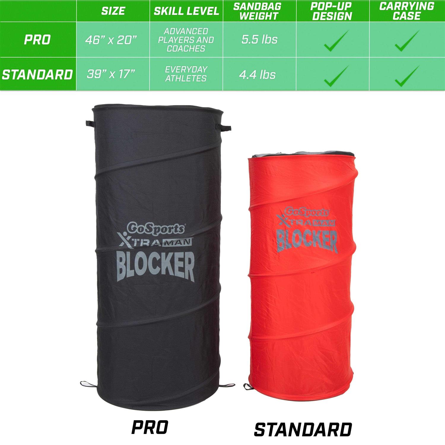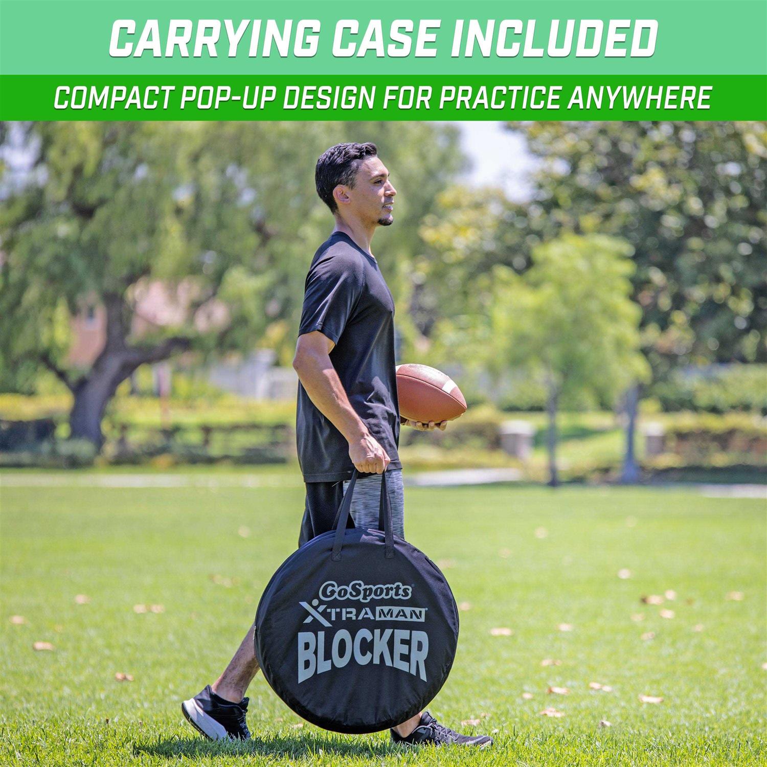 Dummies by GoSports. Details:Introducing GoSports XTRAMAN PRO Blockers, premium stand-in defenders for athletes at an intermediate to expert level. Standing at 3 feet 10 inches, these defenders offer a dynamic training experience that enhances the benefits of standard drills. The complete set includes three collapsible blockers with pre-weighted bases for stability, accompanied by a convenient carry case and instructional drills. Made from durable materials, such as robust polyester and sturdy steel wire, these premium pop up defenders are designed to withstand rigorous drills across various sports like basketball, football, and soccer. Elevate player development by using these blockers to encourage proper footwork and agility on any court or field, both indoors and outdoors. Their collapsible design ensures easy storage in the carry case, making them highly portable. Now take practice on the go with GoSports XTRAMAN PRO Blockers!