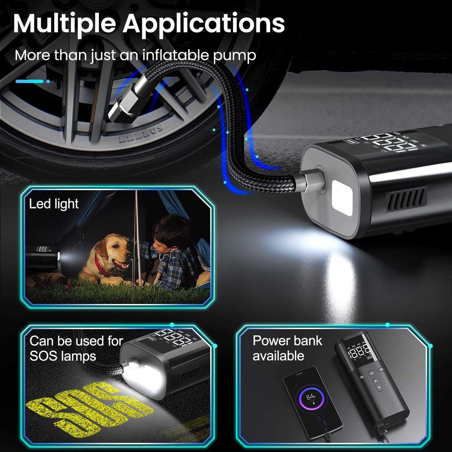 Subversive Design, Palm Control – Do you want a small and powerful tire inflator or portable air compressor? GOXIFACA mini car air tire compressor pumps are only the 48*68*175mm hand sizes that, No need to plug in, it can be used anytime, anywhere after fully charged can be put into your backpack and pocket easily. Preset Tire Pressure & Auto Stop – The tire inflator offers 4 preset inflation modes (bicycles, motorcycles, cars, and balls), 4 pressure measurement units (PSI, KPA, BAR, KG/CM²), and 1 manual mode, making it convenient for beginners. The manual mode allows you to set pressure values according to the inflation object, while the preset modes are designed to meet various inflation needs. Quick & Accurate – Built with the highest quality materials,car tire inflator is a portable tire inflator for car, trucks, SUVs, motorcycles, and bicycles. Quickly inflate your vehicle’s tires in just minutes with precision accuracy up to 120 PSI. Small and compact car air pump that fits in your glove box or trunk. 【Bright LED & Easy to Use】Of course! Super bright LED with 2 lighting modes (Bright &Flashing mode) makes your car air pump suitable for roadside emergencies and nighttime use. so easy to use the portable tire inflator for a car, It is definitely worth your choice! 【Easy Operation】The product has five inflation modes: “Car, Motorcycle, Bicycle, Ball”, and “Normal”. Just screw the air hose onto the air pump and tire valve, start inflation after selecting the inflation model, wait for the machine to stop automatically and it’s over.” Inflator Cordless Rechargeable