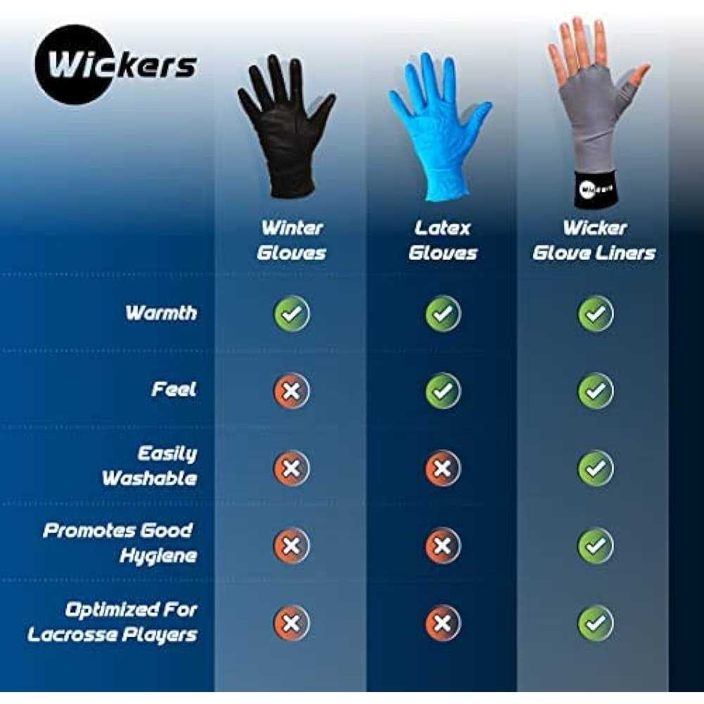 Stay warm in the winter Keep your hands and gloves smelling good Extend the life of your lacrosse gloves Maintain feel of your stick Ditch the rubber surgical gloves Wickers Glove Liners keep your hands warm in the winter and smelling good, without impacting the feel of your stick.