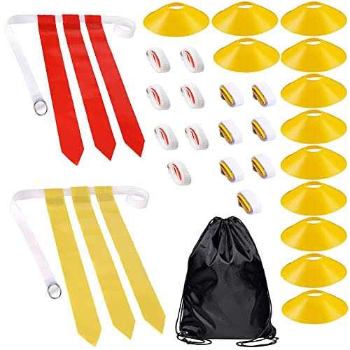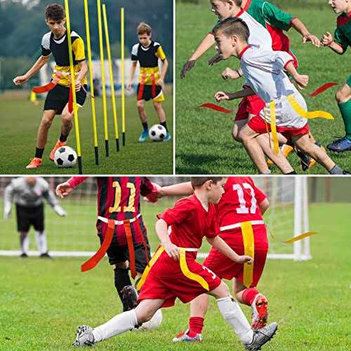 MORE BELTS & MORE FLAGS: Our flag football kit come with 14 belts, 42 flags(21 sides for each of the two colors), and 12 large, highly visibility disc cones, more comprehensive equipment can have more choices. DOUBLE RING CLOSURE OF BELTS: This flag football belts can make to 14 players, enough people can let you enjoy the confrontation and happiness brought by sports. The design of double ring closure the belt to be firmly fixed at the waist, so that everyone can play more freely in the game. DURABLE FLAGS: This flags football set have 42 flags, equal distribution of two colors, bright colors can clearly distinguish teammates and opponents in game confrontation, improving the playability of fair confrontation. Durable special materials designed to withstand more sessions of rough, rowdy games. MORE CONES:Our flag football set Includes 12 large, brightly colored and highly visibility disc cones, so it is very recognizable and you can clearly mark the sidelines, goal lines, playing field and any you location to be marked. ENJOY MORE FUN: This flag football belts kit perfect for family reunions, outdoor football fans parties, summer camps for youth league and recreational play and more. It can also bring more health and joy to kids, more possibilities for children’s games time. It comes with everything you need to play can make you create you and Your teammates own personal field.