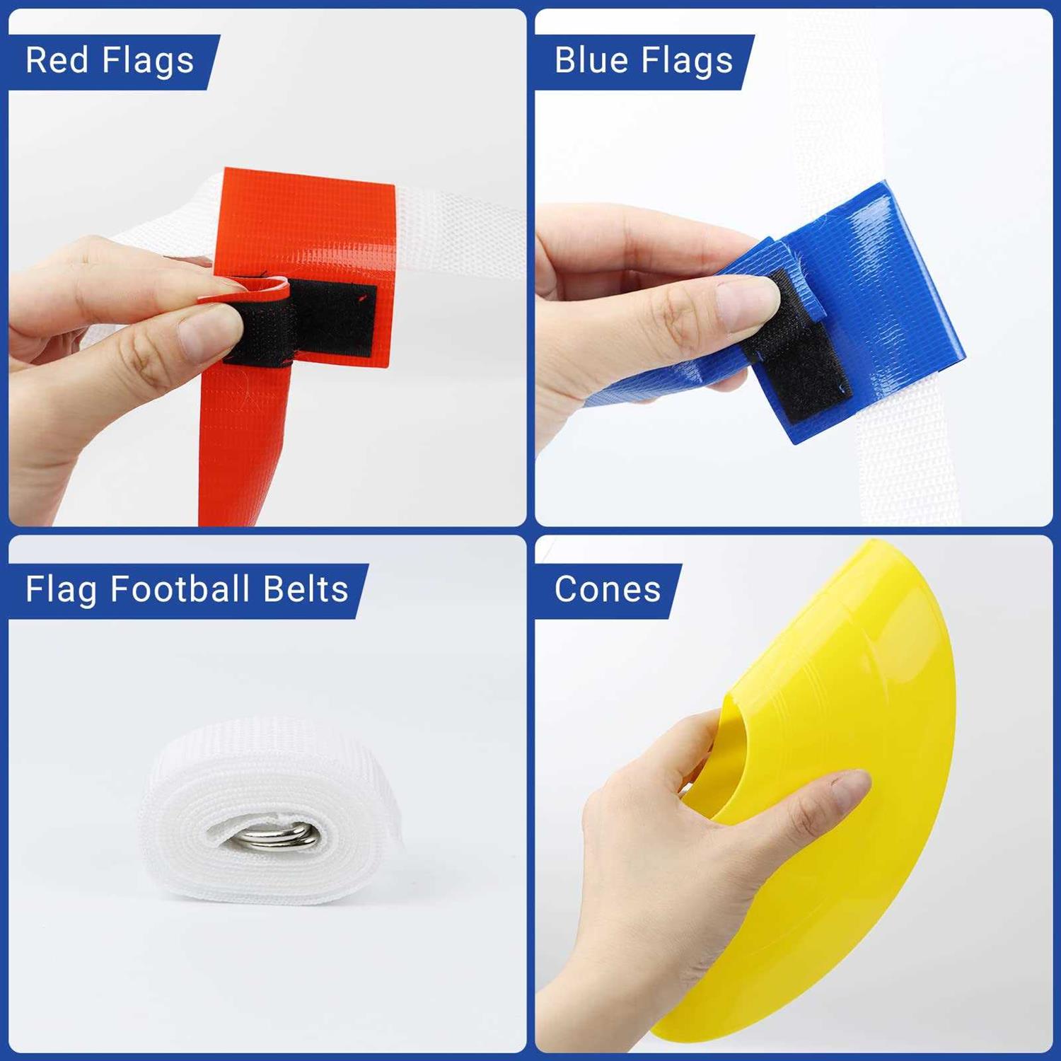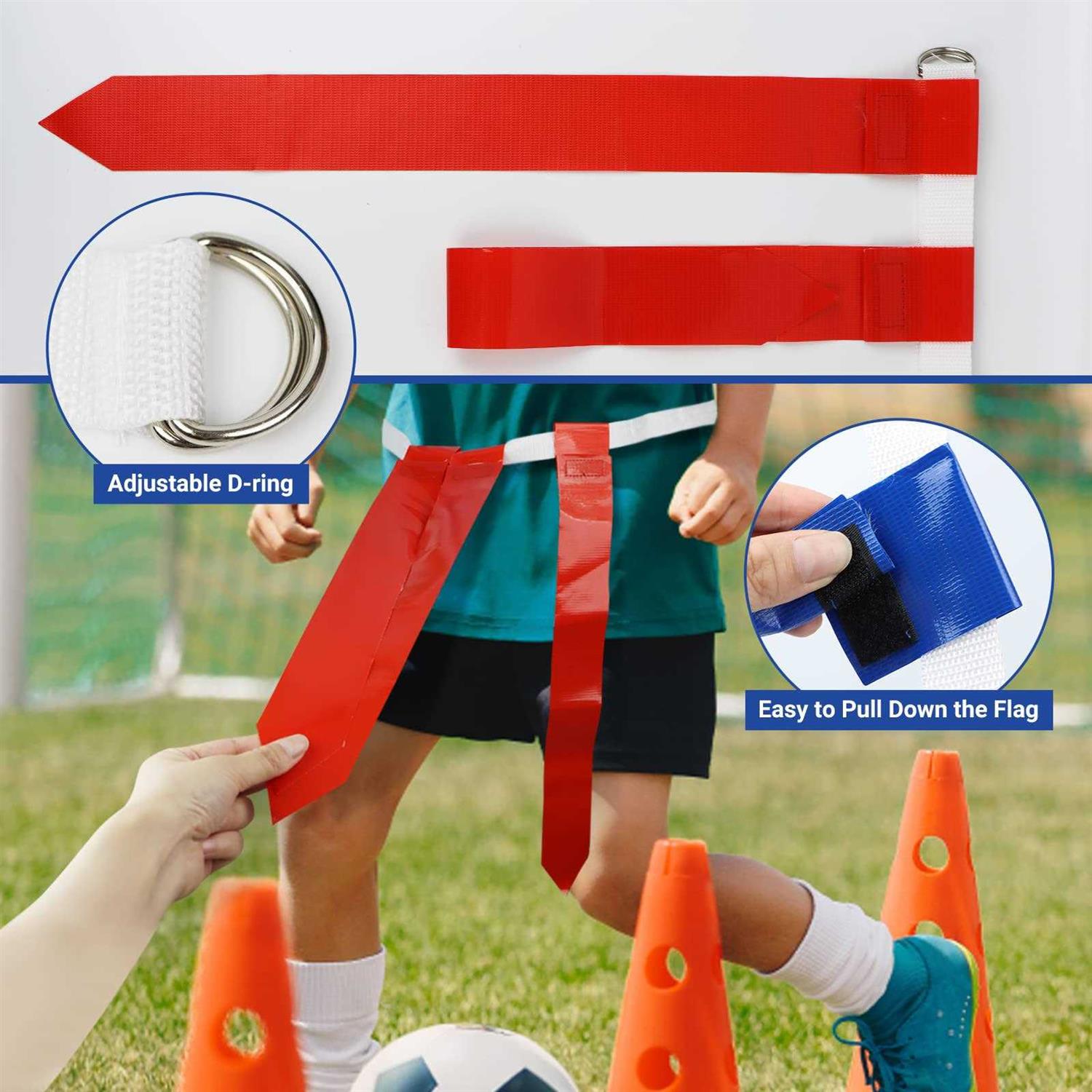 MORE BELTS & MORE FLAGS: Our flag football kit come with 14 belts, 42 flags(21 sides for each of the two colors), and 12 large, highly visibility disc cones, more comprehensive equipment can have more choices. DOUBLE RING CLOSURE OF BELTS: This flag football belts can make to 14 players, enough people can let you enjoy the confrontation and happiness brought by sports. The design of double ring closure the belt to be firmly fixed at the waist, so that everyone can play more freely in the game. DURABLE FLAGS: This flags football set have 42 flags, equal distribution of two colors, bright colors can clearly distinguish teammates and opponents in game confrontation, improving the playability of fair confrontation. Durable special materials designed to withstand more sessions of rough, rowdy games. MORE CONES:Our flag football set Includes 12 large, brightly colored and highly visibility disc cones, so it is very recognizable and you can clearly mark the sidelines, goal lines, playing field and any you location to be marked. ENJOY MORE FUN: This flag football belts kit perfect for family reunions, outdoor football fans parties, summer camps for youth league and recreational play and more. It can also bring more health and joy to kids, more possibilities for children’s games time. It comes with everything you need to play can make you create you and Your teammates own personal field.