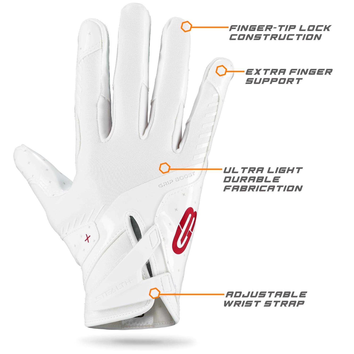 The Grip Boost Stealth 6.0 Boost+ football gloves are engineered for excellence, featuring an advanced grip formula that ensures unparalleled control, allowing you to catch, throw, and handle the ball with unmatched precision. The Boost+ Grip technology provides an adhesive-like grip without sacrificing flexibility, giving you the confidence to make game-changing plays with your football gear.