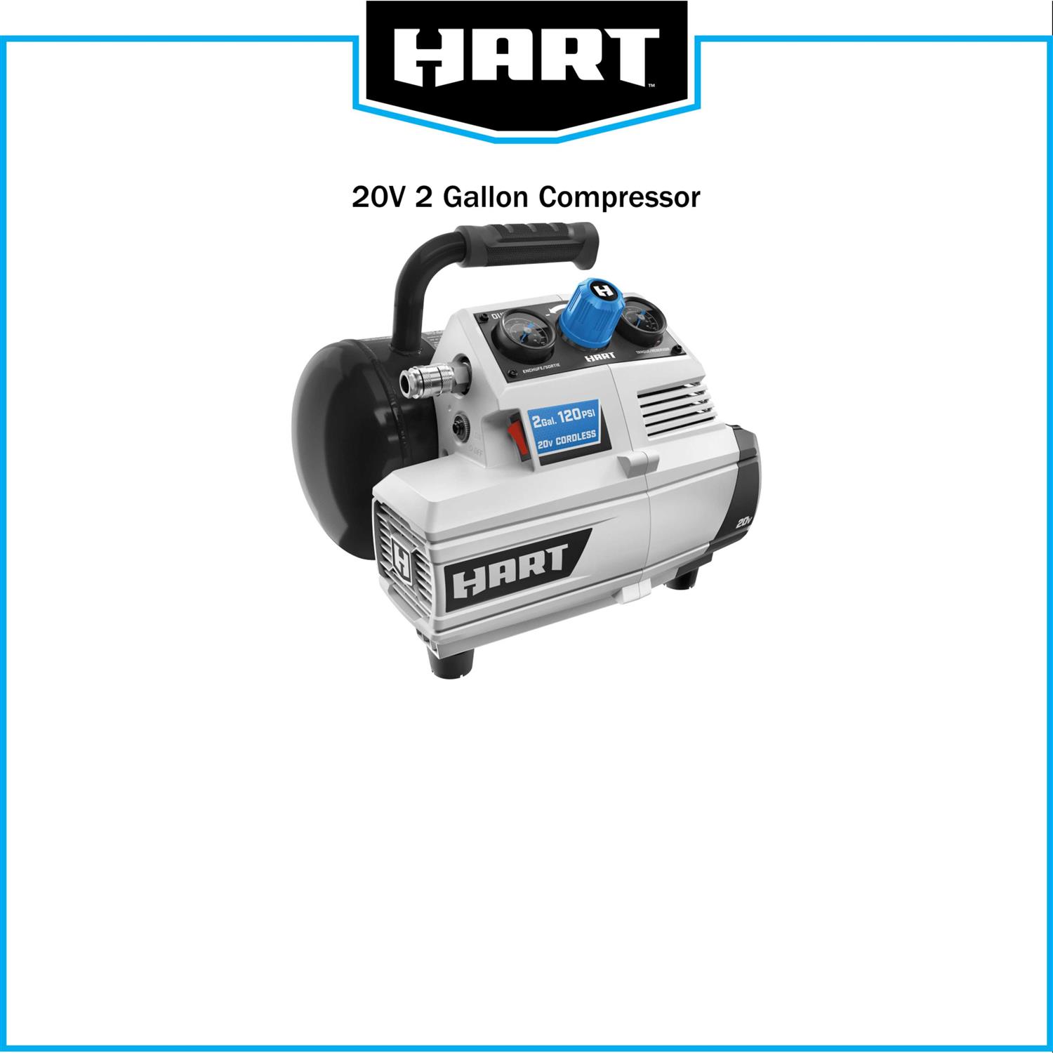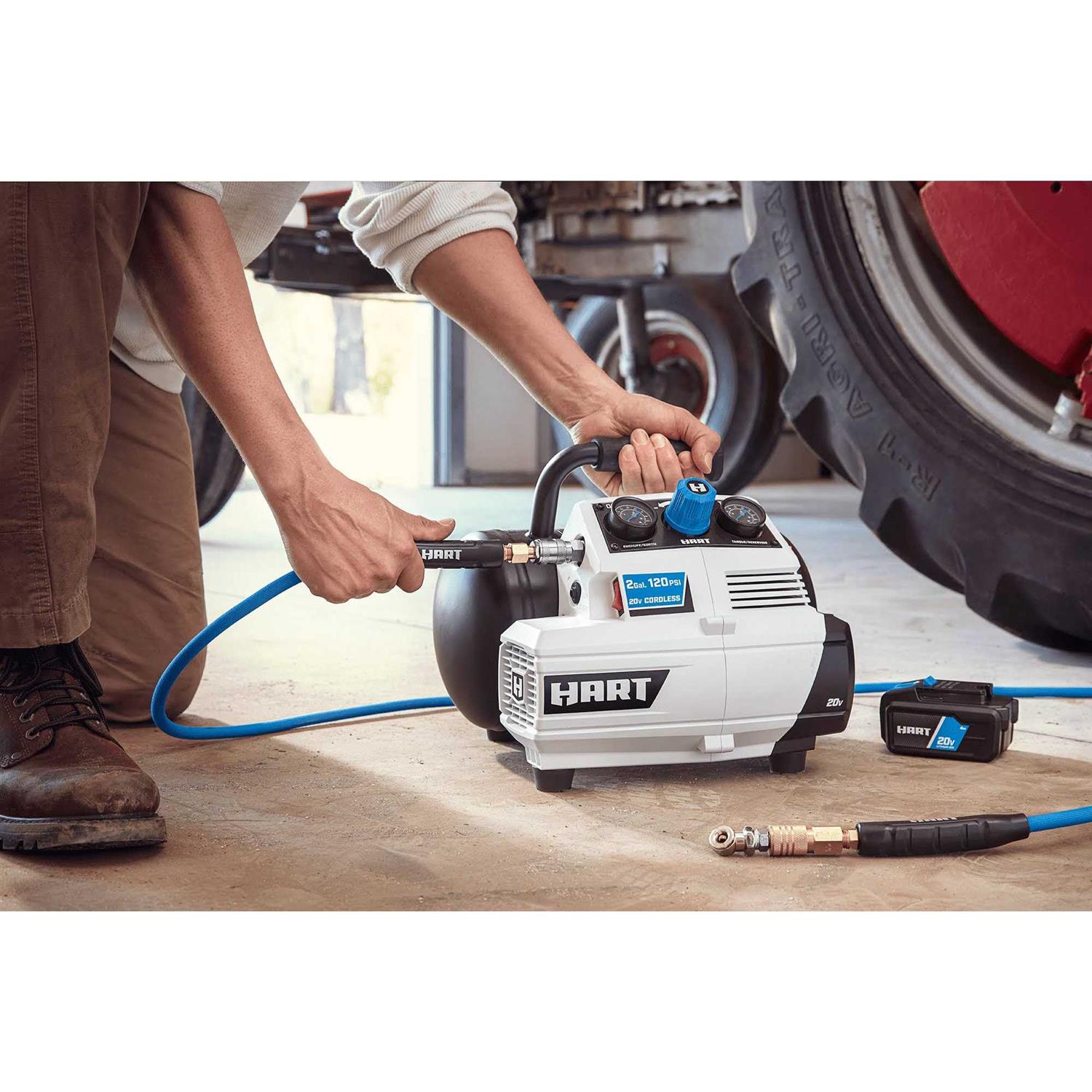 HARTs 20V 2-Gallon Compressor gives you the ability to work more efficiently without the hassles of cords. Compact and convenient, this unit is ideal for topping off tires, old and new, and small inflatables anywhere you go. You can inflate a tire from flat to full in under 1 minute. It’s also perfect for pneumatic trim work, with cordless convenience. Youll find the rubber overmold handle makes transporting it a lot more comfortable. It also features a universal push-to-connect quick coupler for quick and easy 1-handed use. Another convenient feature is that this pump is oil-free. That means you dont have to worry about oil levels and all the maintenance that goes with it. The 2-gallon tank allows you to do more work with less downtime. This tool works with all HART 20V batteries, and the HART 20V battery in this kit powers all HART 20V tools, outdoor equipment, automotive, and lifestyle items!