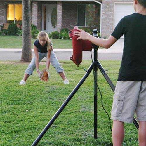 Easy to use and assemble, the machine features three tubular steel legs that snap into the tri-pod stand, which attach to the high-impact composite pitching housing with two quick-attach knobs. The auto-ball feeder just slides onto the pitching housing and you’re ready to go. Place 12 baseballs, wiffle balls, or lite-balls into the feeder, adjust the pitch height, and it pitches with pin-point accuracy. The auto ball feeder pitches a fastball at you every 10 seconds at speeds of up to 45 miles per hour. Uses 110 V A/C power supply. Automatic feeder pitches a ball every 10 seconds.
