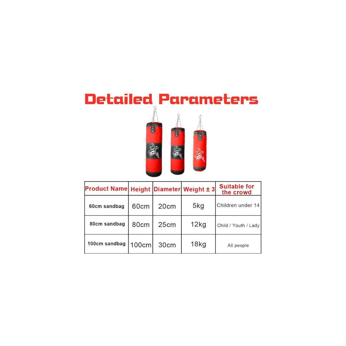 Get Fit From The Comfort Of Your Own Home … Whether You Are Boxing Training, Testing Out A New Style Of Fitness Or Releasing Some Anger Or Stress! These Are Unfilled Hanging Boxing Bags … Simply Fill Them With Sand. Material: Canvas+Pu Leather + Elastic Sponge Three Sizes Available: 60Cm (Diameter 34Cm), 80Cm (Diameter 38Cm) Or 100Cm (Diameter 46Cm) You Will Receive: 1 X Empty Sandbag 1 X Metal Chain 1 X Hook 1 X Carabiner