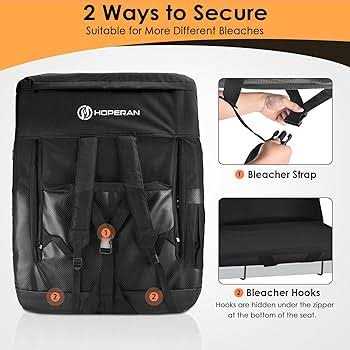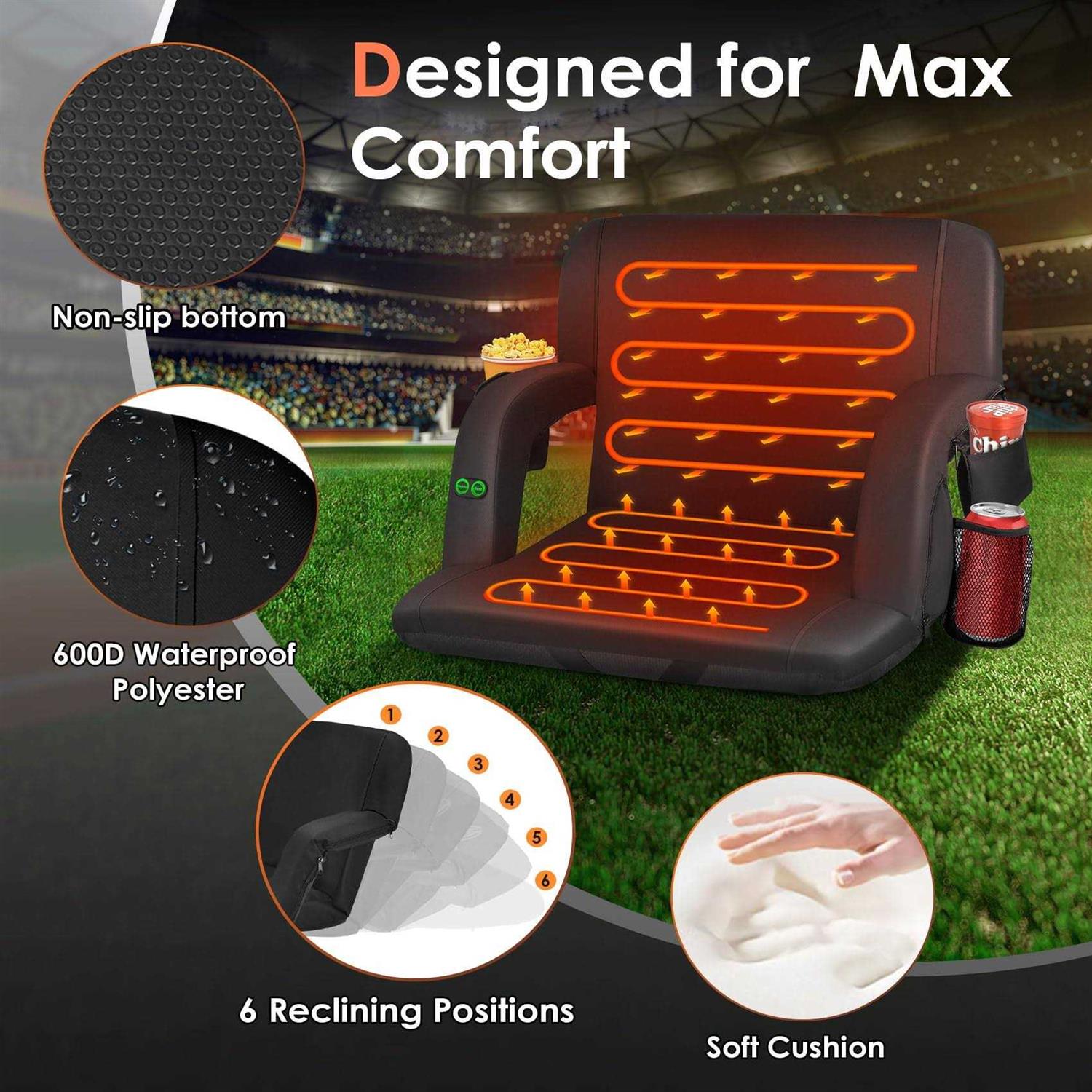 Customized Comfort: Our heated stadium seats for bleachers with Newest Dual-zone Controlled Heating System, it allows you to adjust the temperature of the backrest and seat cushion independently, offering flexibility and energy efficiency. Experience hours of soothing heat using a USB power bank and stay cozy even in chilly weather. Choose from 3 heat levels (high, mid, low) and reach a max temp of 130°F. ️ Please NOTE: Power Bank NOT included. Unmatched Comfort: Our heated bleacher seats are designed to provide exceptional comfort and support during your stadium experience. Heated folding stadium seats also feature the reclining property. With 6 different reclining adjustments, allowing you to choose according to your needs. The armrests are also adjustable. A very comfortable 18″ (arm up) or an extra roomy 23″ (arm down). Seat stability is ensured and movement is minimized to ensure a safe and reliable seating experience. Say goodbye to any concerns about your seat slipping off the bleachers when you leap up to cheer for your team or children. Durable and Supportive: Stadium seats for bleachers with back support surface is made of waterproof polyester and 600D Oxford cloth, providing resistance to accidental splashes and light rain, so you can enjoy worry-free usage regardless of the weather. Bottom is made of PVC leather with raised granules, providing increased traction and easy cleaning. Moreover, the seat frame is built to last, withstanding prolonged usage and providing reliable support for different weights. Portable and Multi-Purpose: Our stadium seating for bleachers with multiple pockets where you can conveniently store your bottles, snacks, and personal items. With 2 shoulder straps, it can be easily carried like a backpack. This means you can take it anywhere you go.