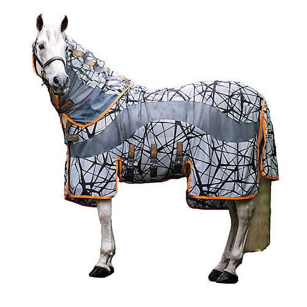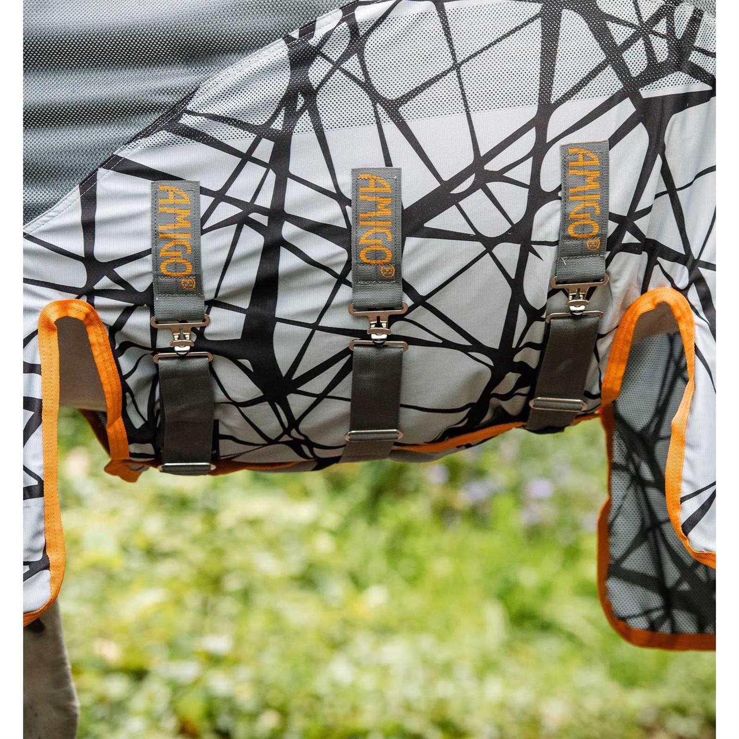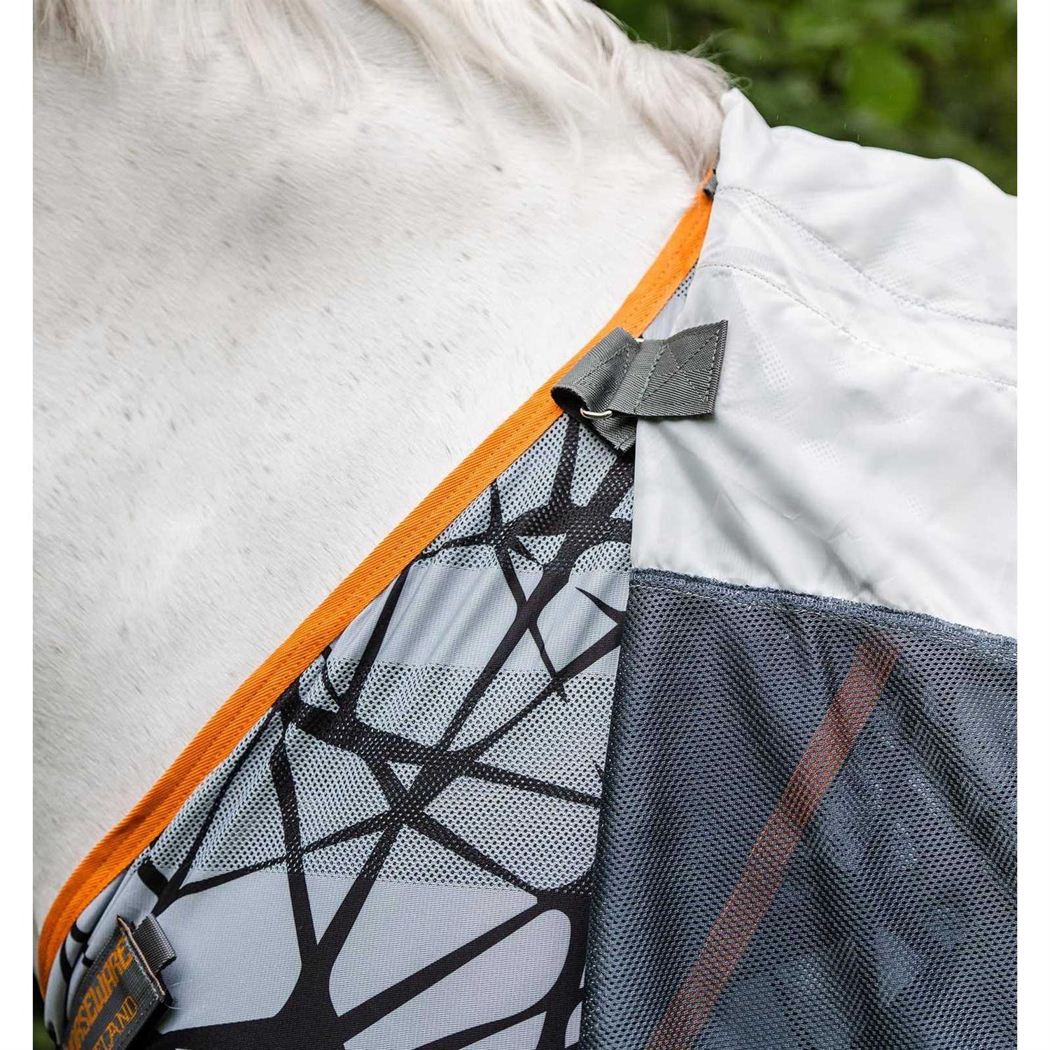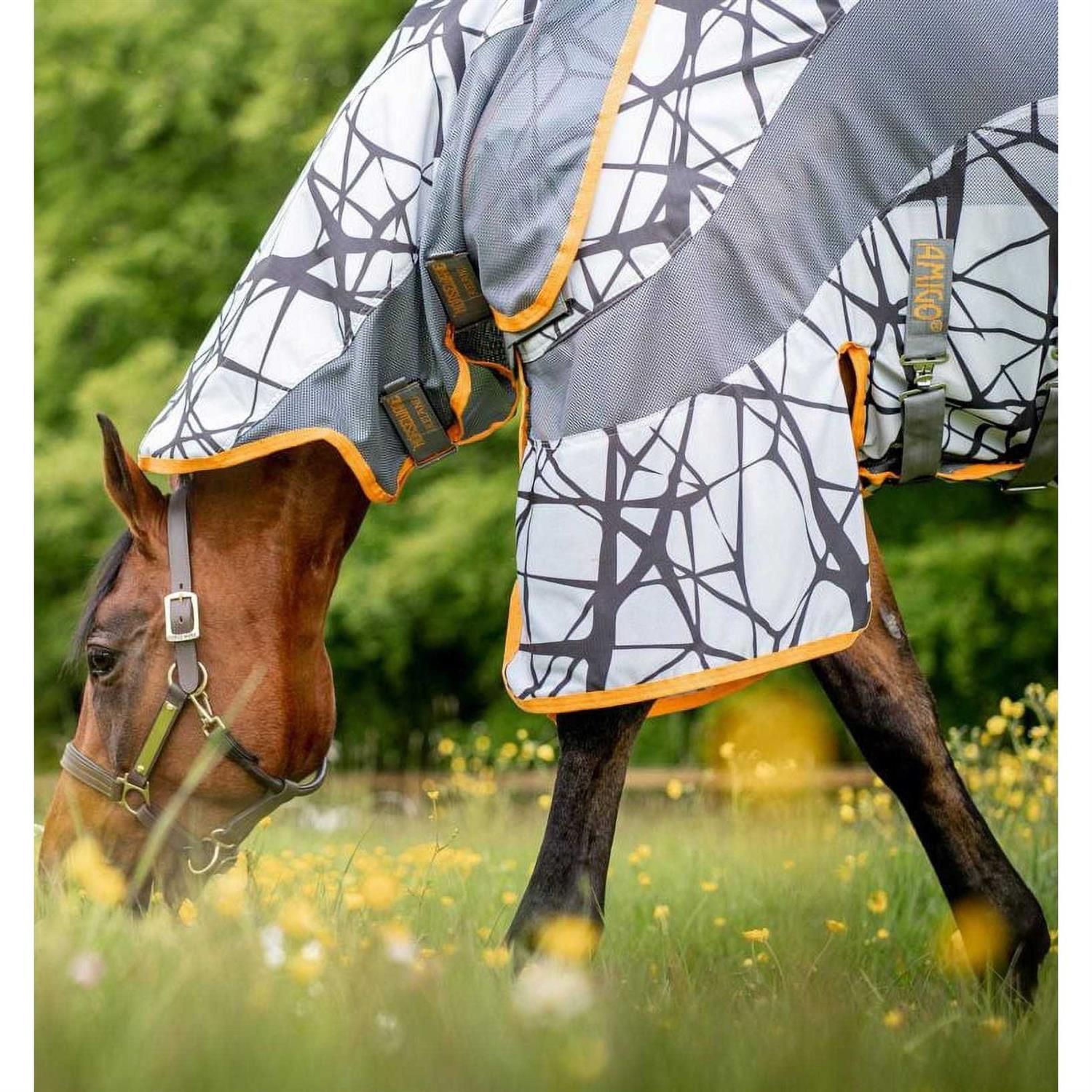 Beat irritation from flies landing on your horse this summer with the Amigo CamoFly Fly Sheet (No Fill) with a detachable neck cover. Embracing extensive research and inspired by the wild zebra’s natural camouflage, the Amigo CamoFly Fly Sheet’s pattern will deter and confuse flies from landing on your horse. Not just a pretty pattern but stripes with a purpose! Our bespoke monochromatic pattern helps camouflage your horse from annoying bugs and flies with layered black lines on a grey background, which create an optical illusion in a fly’s eye. The pattern breaks up the horse’s shape, leaving the fly confused and unable to figure out where to land. In addition to the sheet’s unique print, the breathable close weave mesh offers 65% UV protection from the sun and drapes over your horse’s neck and body, with overlapping protection around your horse’s belly with three adjustable surcingles and Velcro closure for maximum protection from insects. Extra depth to the knees offers extended leg protection for your horse. The detachable hood gives you a choice of breathable UV protection, and the lightweight mesh encourages optimum airflow to keep your horse comfortable in the summer months. Inspired by wild zebras and created by Horseware innovation for the ultimate protection from insects. MATERIAL 100% Knitted polyester mesh.