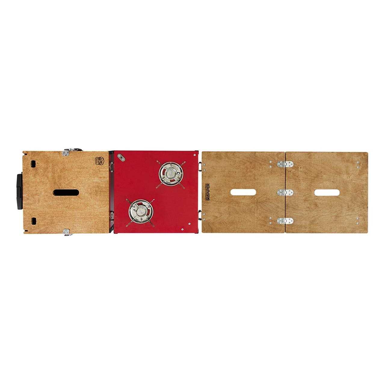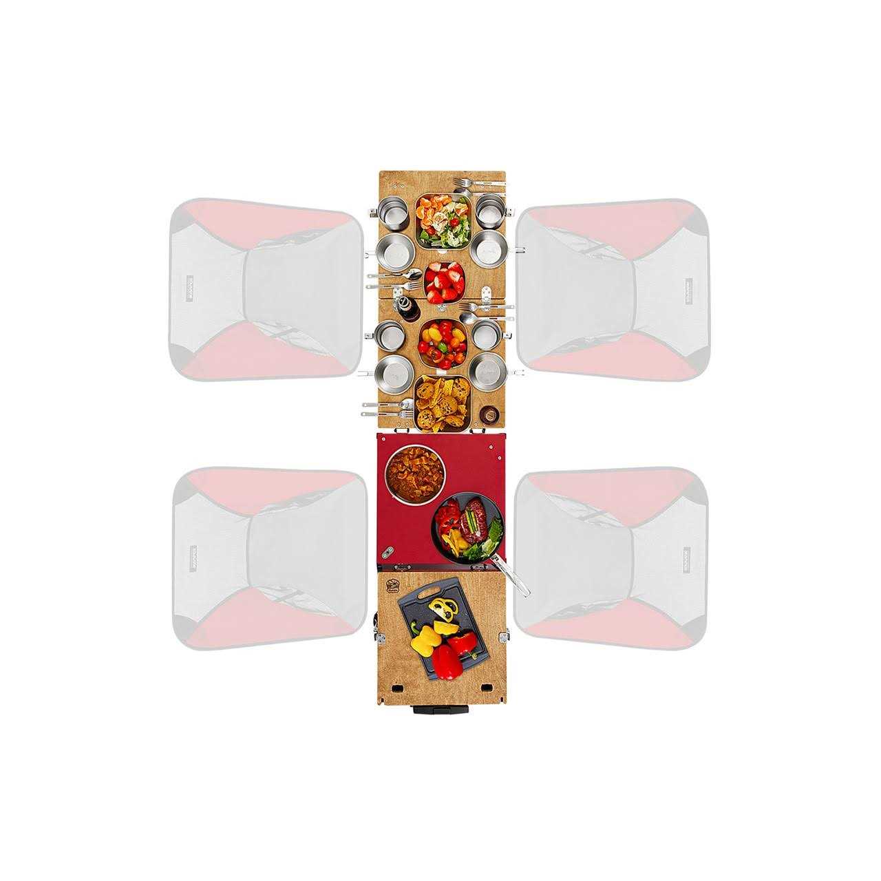 - Includes: rolling storage, 2-burner stove, folding table