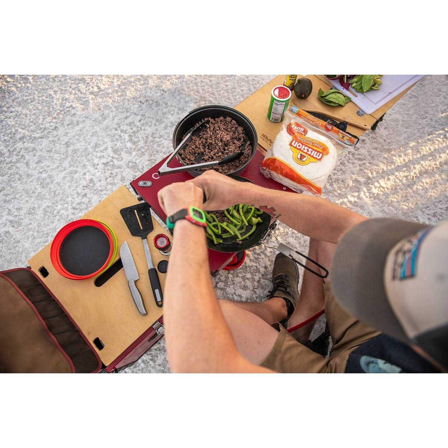 The Aioks (pronounced “eye-ox”) has everything you need for outdoor cooking, all in ONE box. Whether you’re making grilled cheese or a five-course feast, Aioks is the portable camp kitchen box for your outdoor adventures. The built-in birchwood table helps you serve up your best meals (and memories) for friends and family on your camping trip in the wild. Picnics are made easy with your new favorite camp kitchen box.