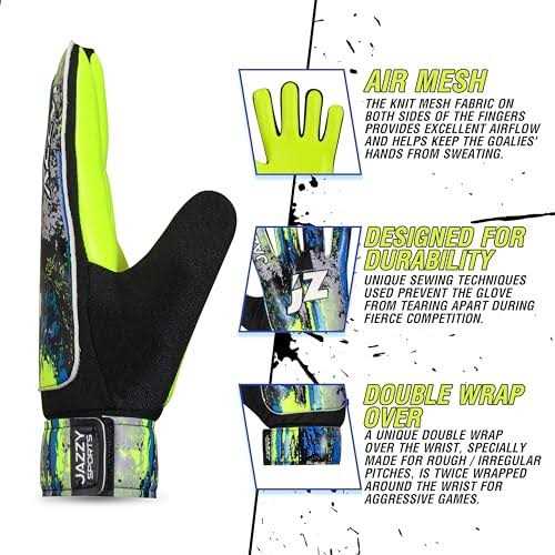 Goalkeeper Gloves by Jazzy Sports. Details:Jazzy Sports Football goalie gloves adult | kids Soccer Goalie Gloves for Kids Boys Children Youth Goalkeeping with 4mm Latex Anti-Slip Palm Finger Spine Protection having Exclusive 3D Embossed Design Over Double Wrap For more Protection in Goalkeeping # Features: PERFECT FOR ALL WEATHER: The kids Football Gloves can withstand in all-weather and used around the year. # BREATHABLE AIR-MESH: The air-mesh fabric fit on the finger side and top hand side of the goalkeeper gloves kids that provides excellent breathability and protect your hands from sweating. # COMFORTABLE: The double wrap-over goal keeper gloves wrist keeps your hand more comfortable while playing. #Stylish Design: Jazzy Sports soccer gloves goalkeeper men has a unique design with Premium Printing and Logo Embossed on it that is eye catching and best visible in dark place. Latex on palm of soccer goalie gloves adult makes more grips while catching football # Durable &…