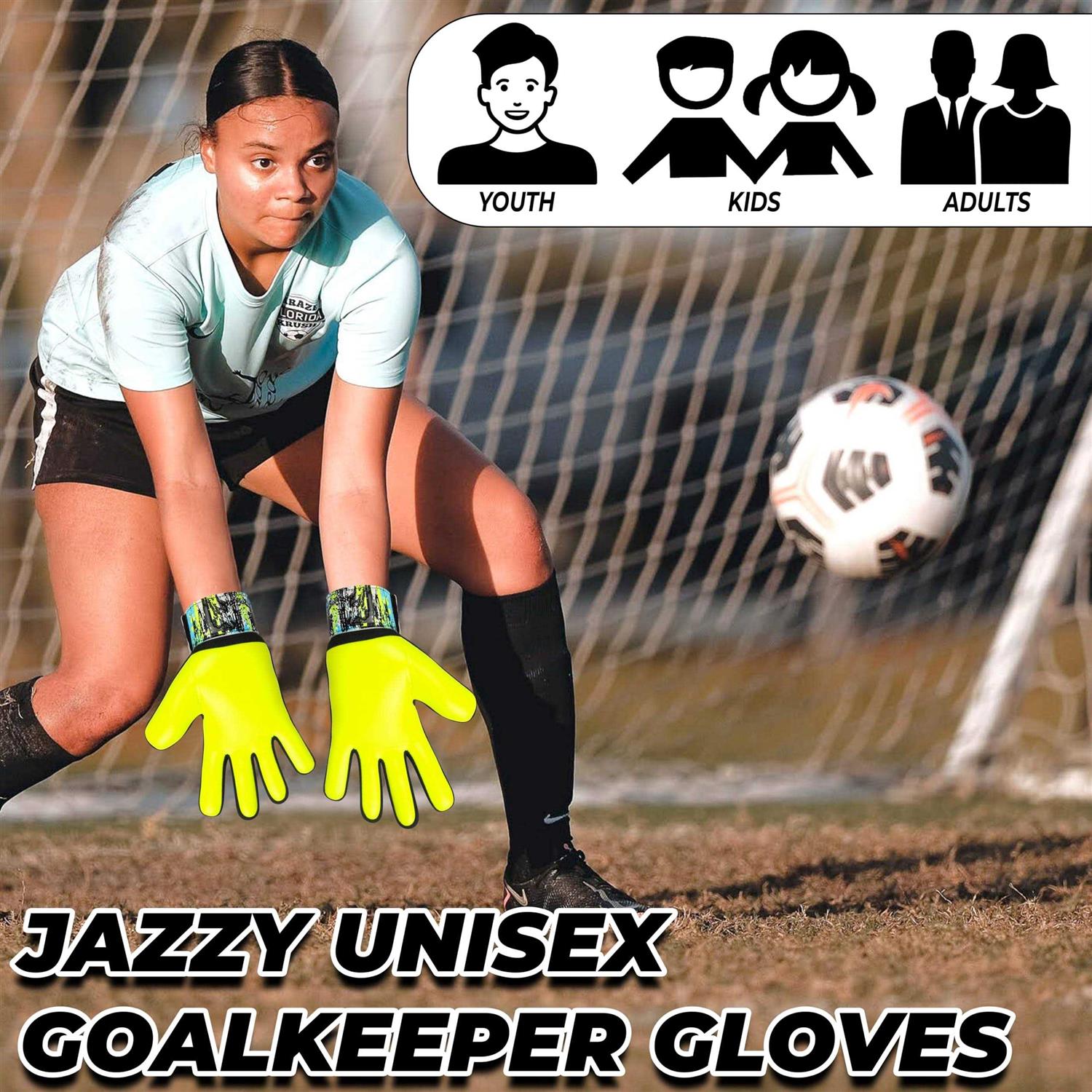 Jazzy Sports Soccer Goalkeeper Gloves for Kids Boys Children Youth, Funky Football Goalie Gloves Anti Slip 4mm Latex Palm with Strong Grip & Doub